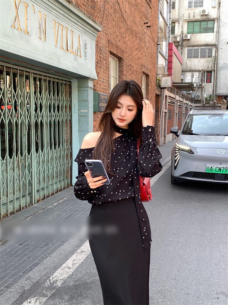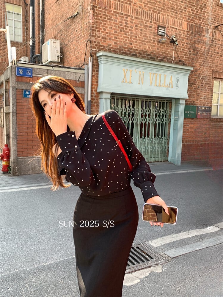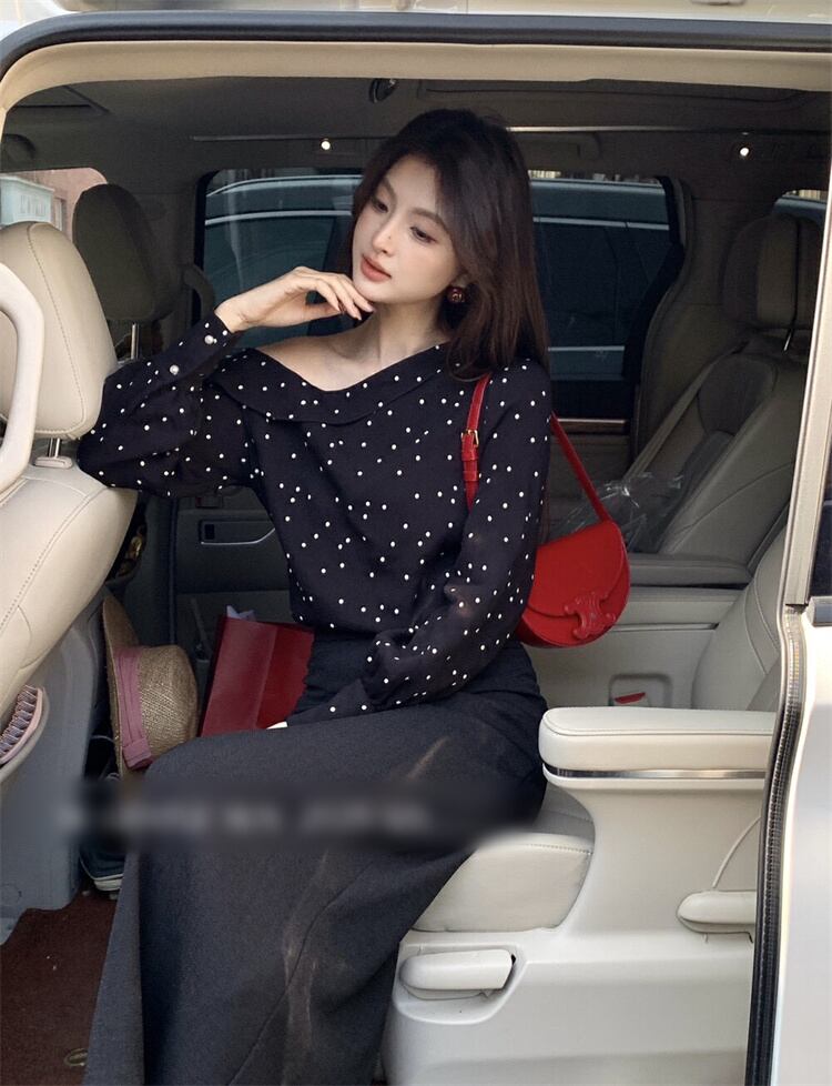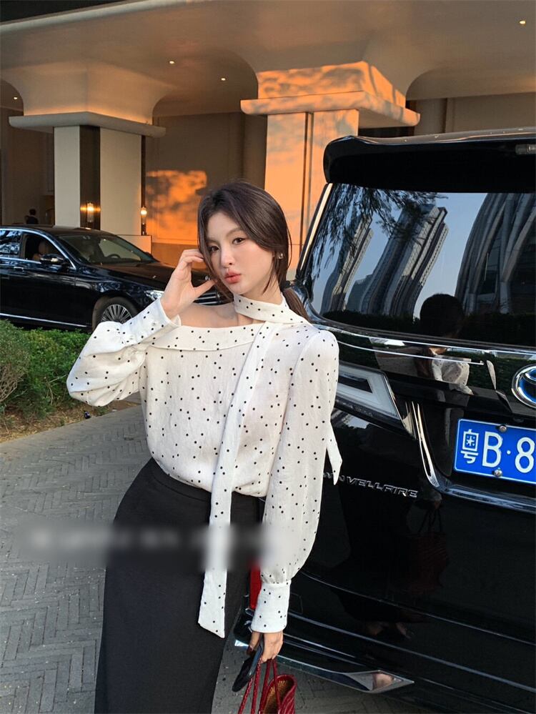◎【送料無料】モデルはあなたです 斜め肩デザイン×レトロドット 2025春トレンド シースルー素材 ゆるふわシルエット