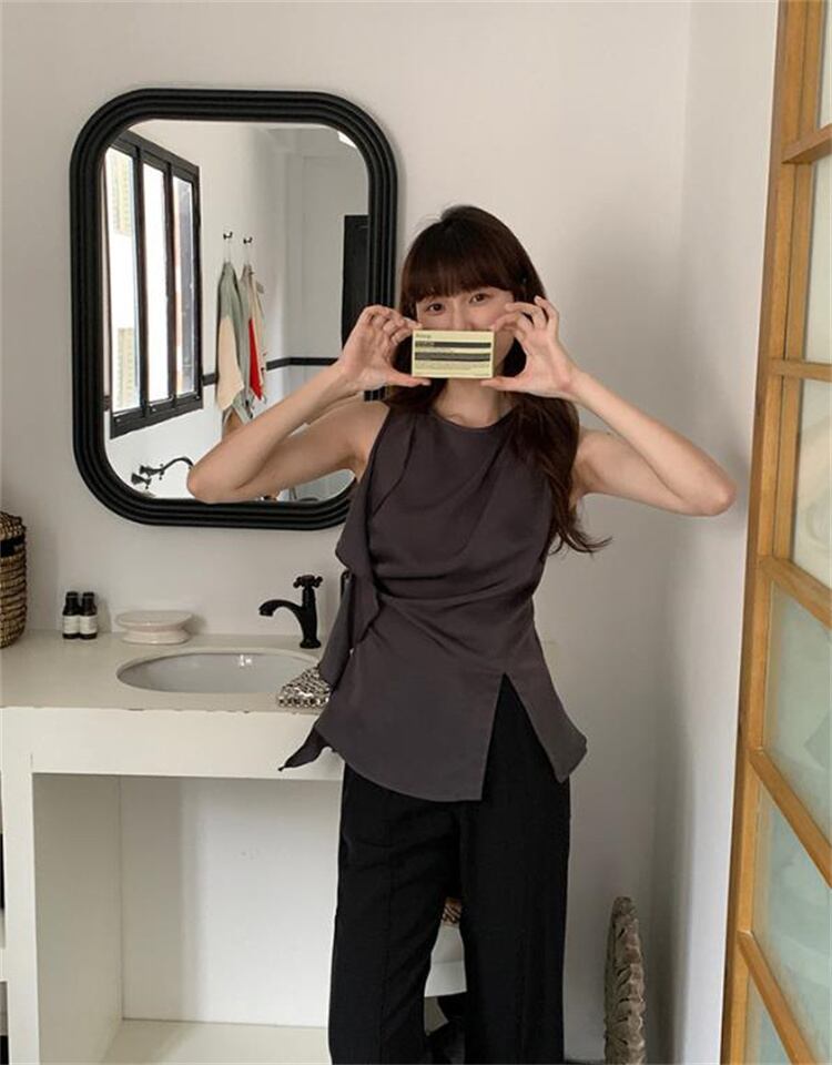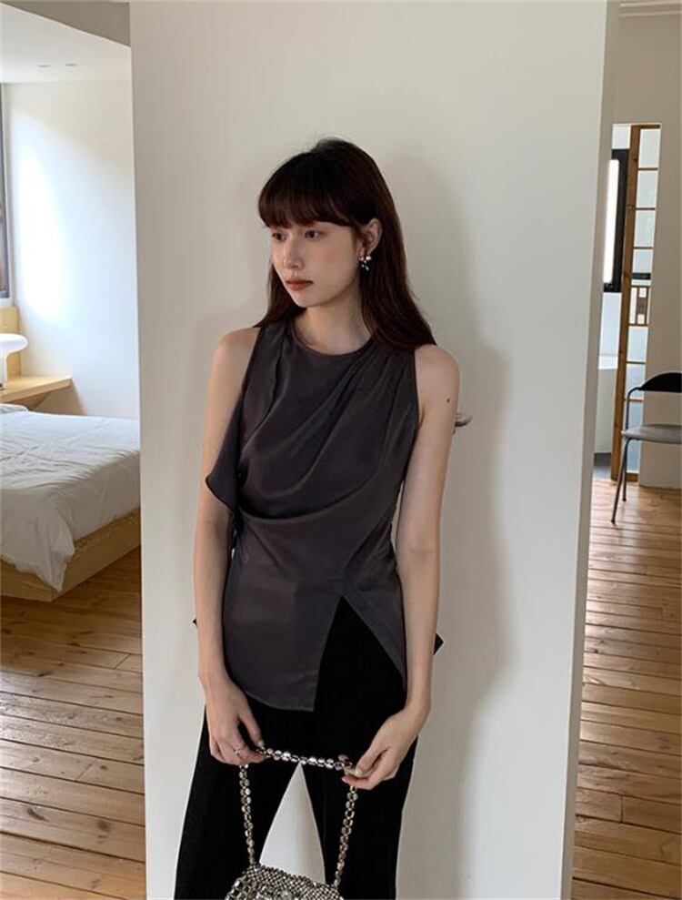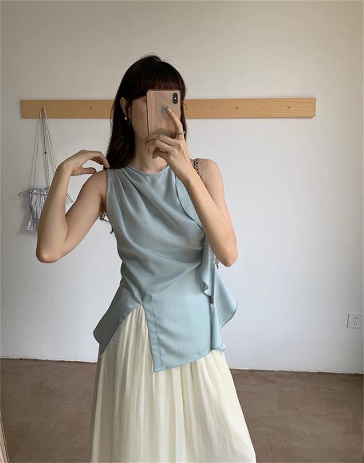 レースフリル加工 アシンメトリックデザイン ノースリーブシャツ ラウンドカラー