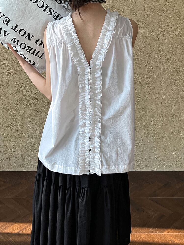 Vネック 花びら襟 ノースリーブシャツ 木目デザイン 夏用 2way着用