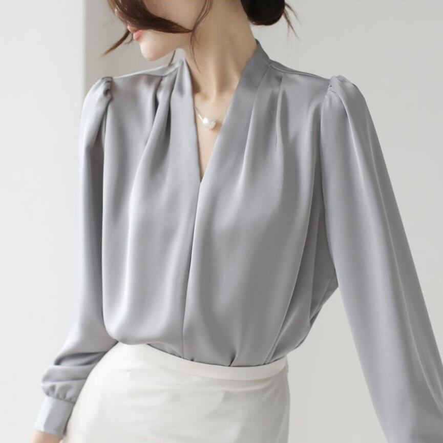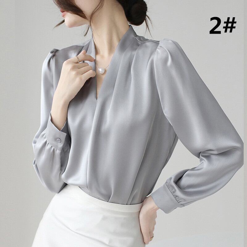 ◎【送料無料】シャツ ブラウス Vネック トップス レディース サテン風 シンプル 気質