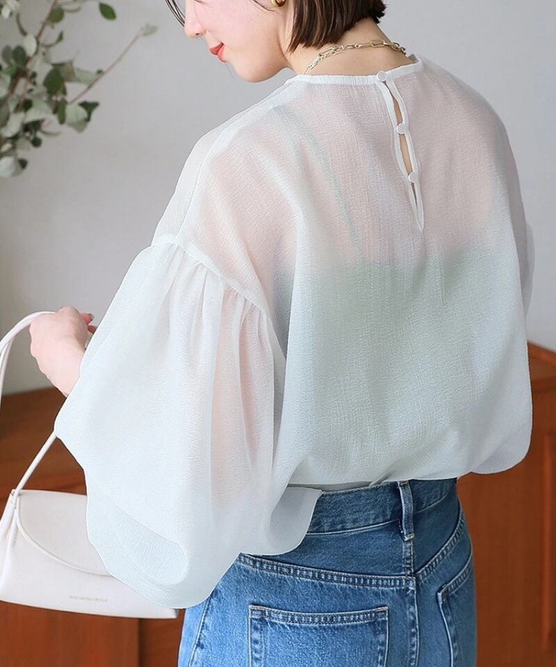 ◎【送料無料】2024春夏新作 トップス 透かしラウンドネック 長袖 フレア袖 シャツ 体型カバー レディース おしゃれ