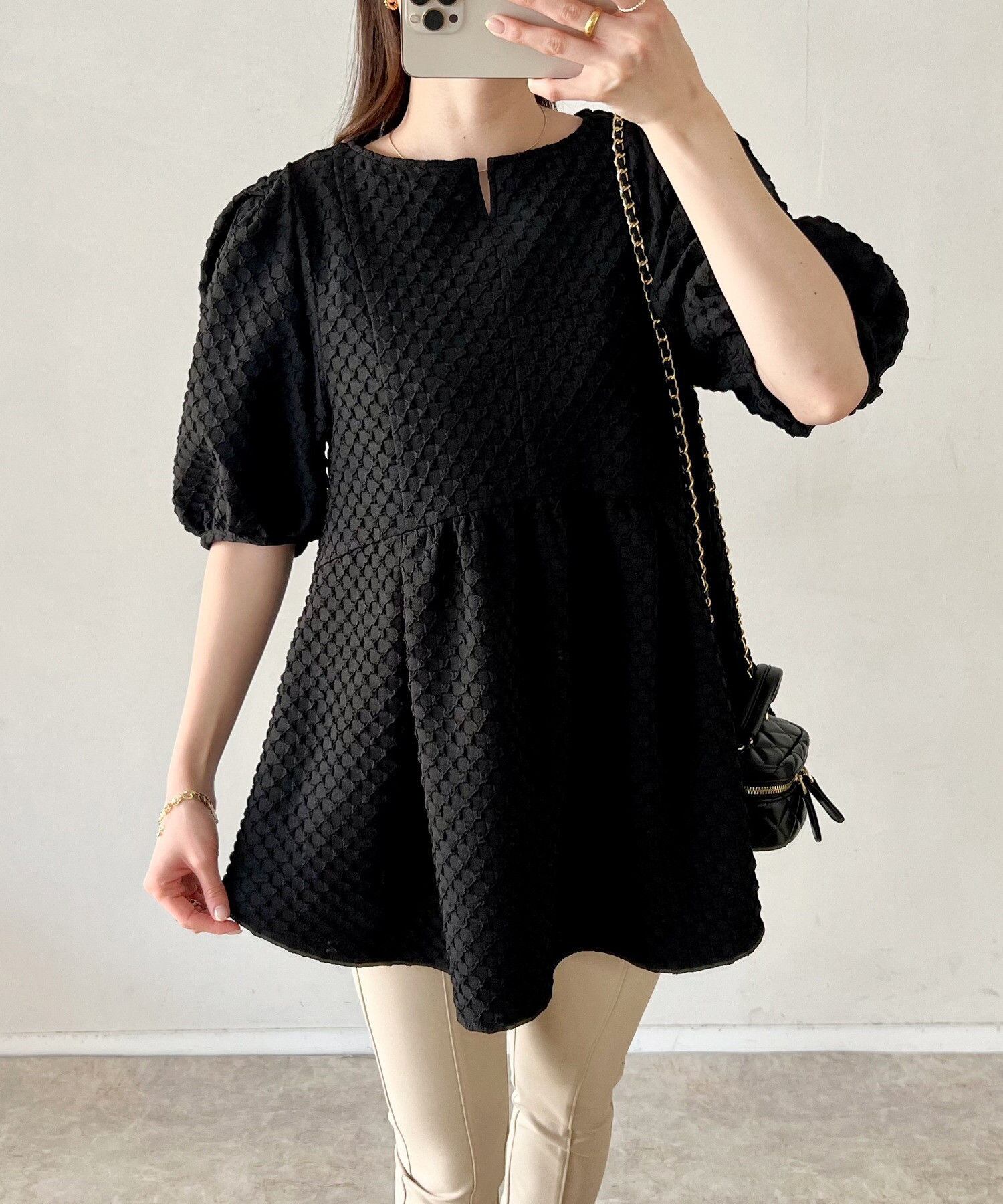 ◎【送料無料】2023春夏新作 トップス ラウンドネック 半袖 体型カバー フレア袖 レディース