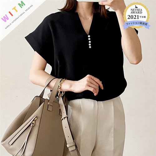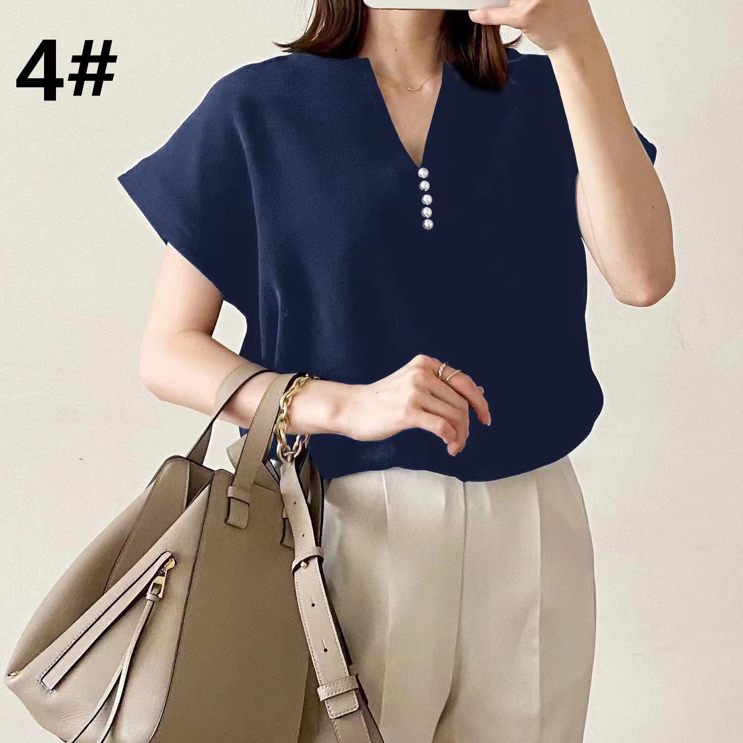 ◎【送料無料】2023春夏新作 真珠 トップス 韓国風 Vネック 半袖 体型カバー 着回し レディース