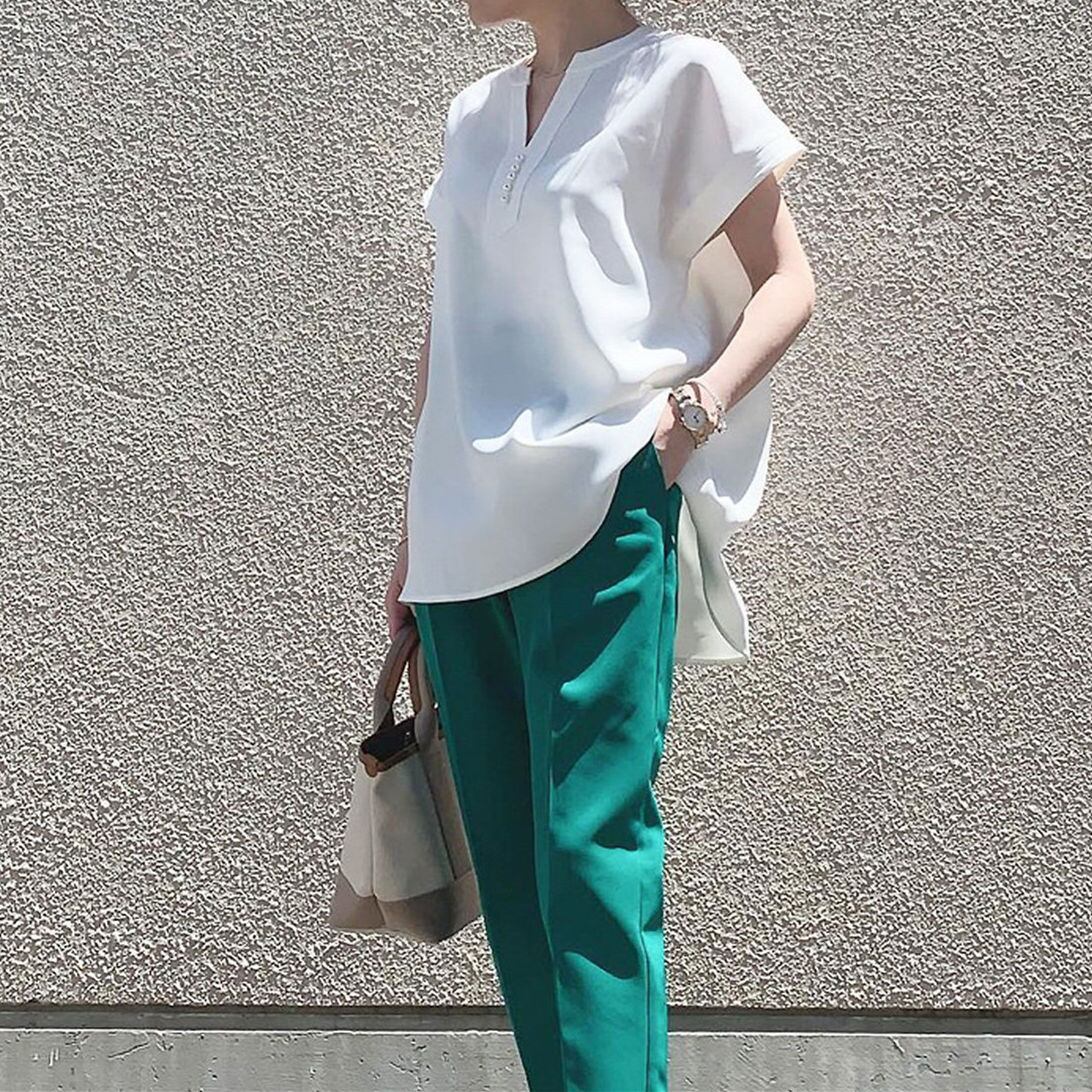 夏にピッタリな素材のトップスは今季注目のアイテム。