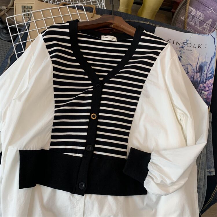 ゆったりする カジュアル ボーダー ベースシャツ フェイク2ピース 長袖 Tシャツ スリム 上着