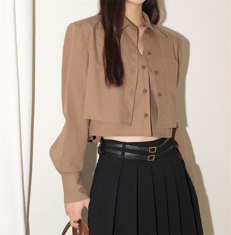 ゆったりする シャツ ギャザリング スリム 大人気 ダブルボタン デザインセンス フェイク2ピース