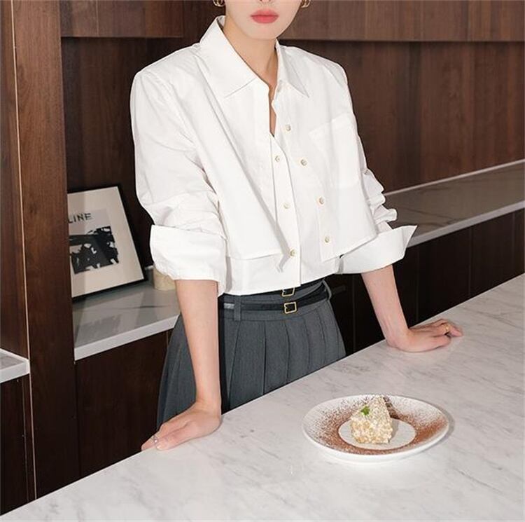 ◎【送料無料】ゆったりする シャツ ギャザリング スリム 大人気 ダブルボタン デザインセンス フェイク2ピース