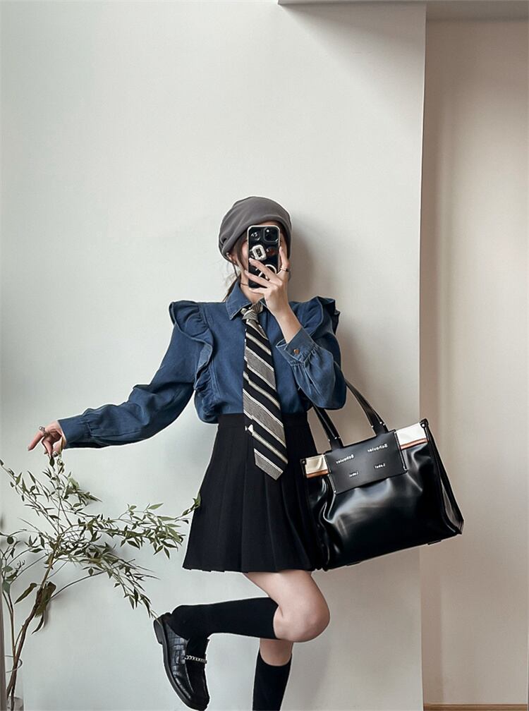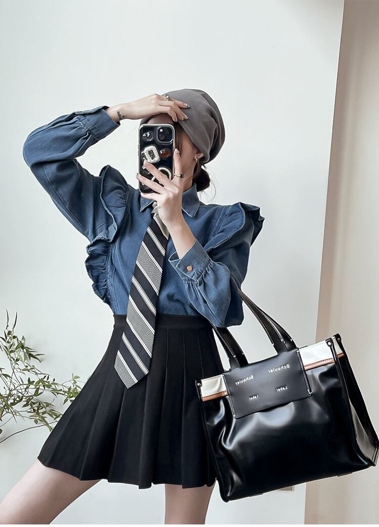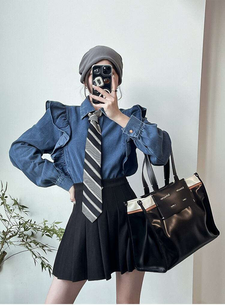 ◎【送料無料】フリル シック カジュアル トップス 怠惰な風 デニムシャツ 秋 デザインセンス タイドファッション
