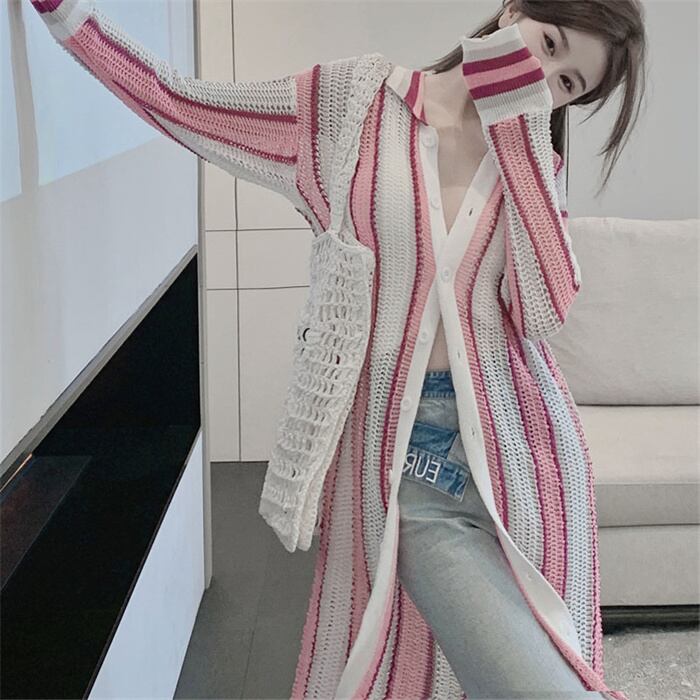 ◎【送料無料】大満足のレビュー多数 コントラストカラー/ストライプ/シン/ニット/ブラウス/ミドル丈/カーディガン/コート