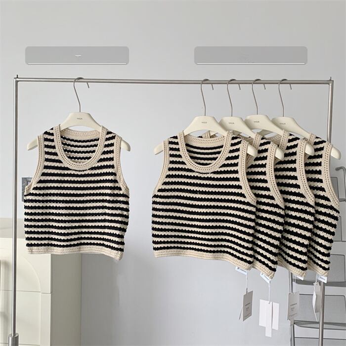 店長推薦 黒と白のストライプ/ホローアウト/ニットベスト/サスペンダー/ノースリーブ/ベスト/トップス