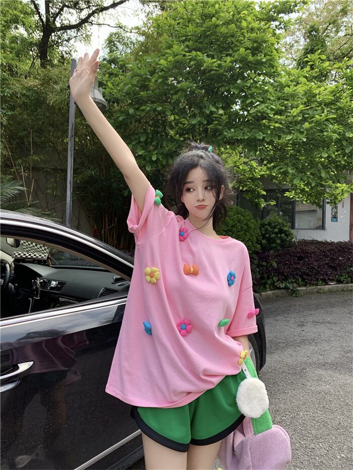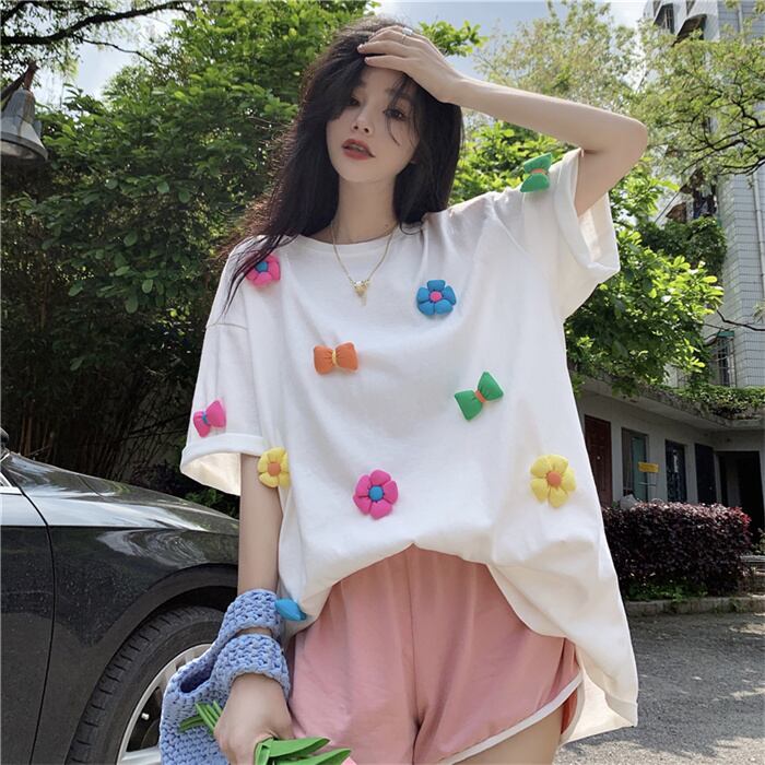 今年売れてます大きいサイズの婦人服/夏/ゆるい/重工業/花/デザインセンス/ニッチ/白/半袖/Tシャツ/潮