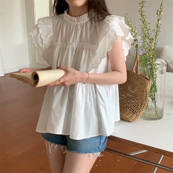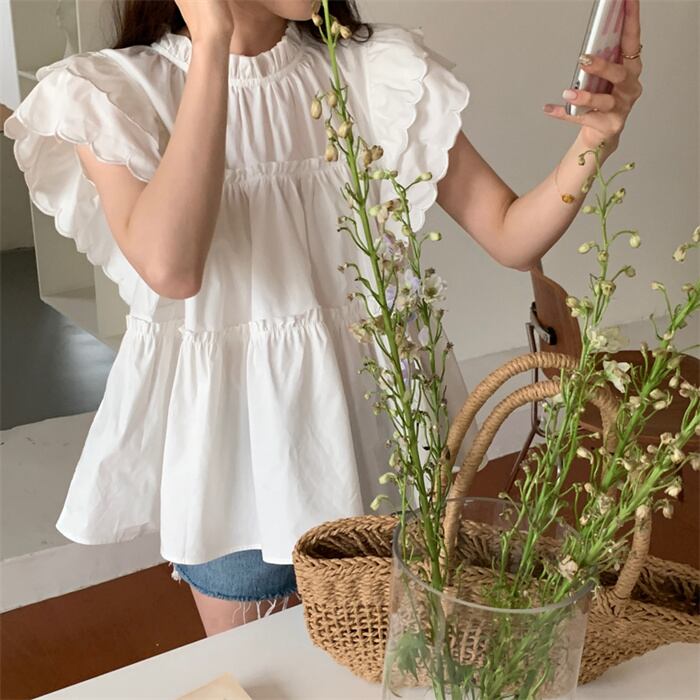 韓国スタイル/デザインセンス/フレンチスタイル/スウィートステッチ/ホワイト/ベビーシャツ/トップ/シャツ