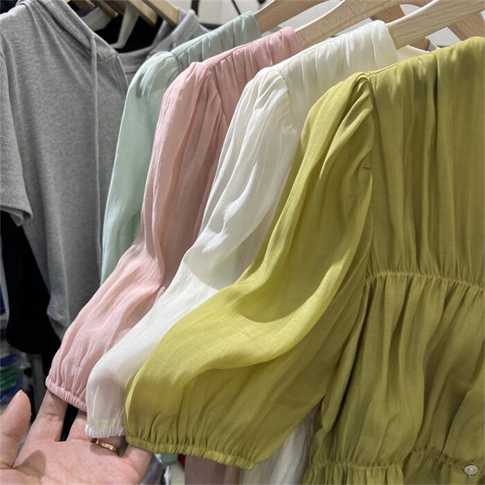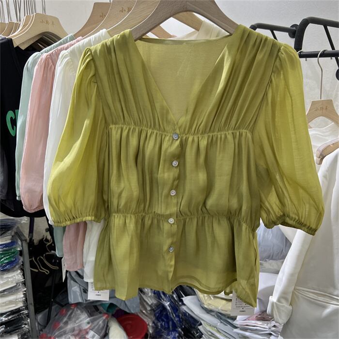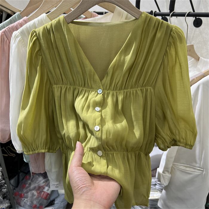 IN独特の存在感Vネック/パフスリーブ/シフォンシャツ/女性/2022/夏/新作/スウィート/ウエスト/シャツ/トップ