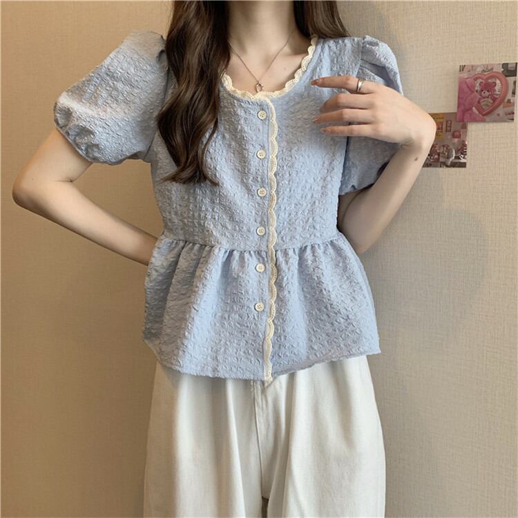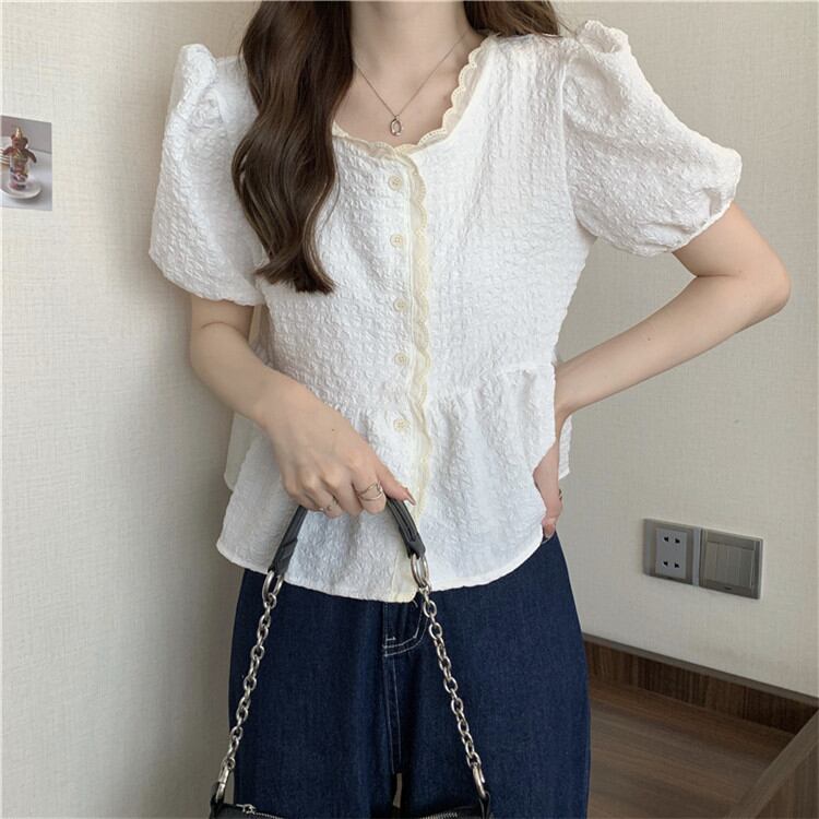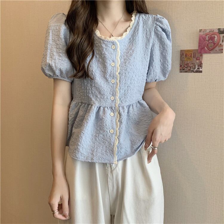 ◎【送料無料】レース 人形の襟 シャツ 夏の新作 可愛い パフスリーブ 半袖 トップス sweet系