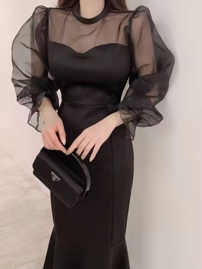 【送料無料◎】 エレガントなスプライスメッシュスリムフィッシュテールドレス レディースロングスカート 春2026 韓国風ニットポリエステルファッション シティ通勤