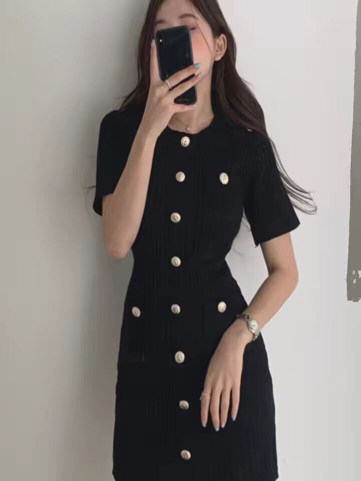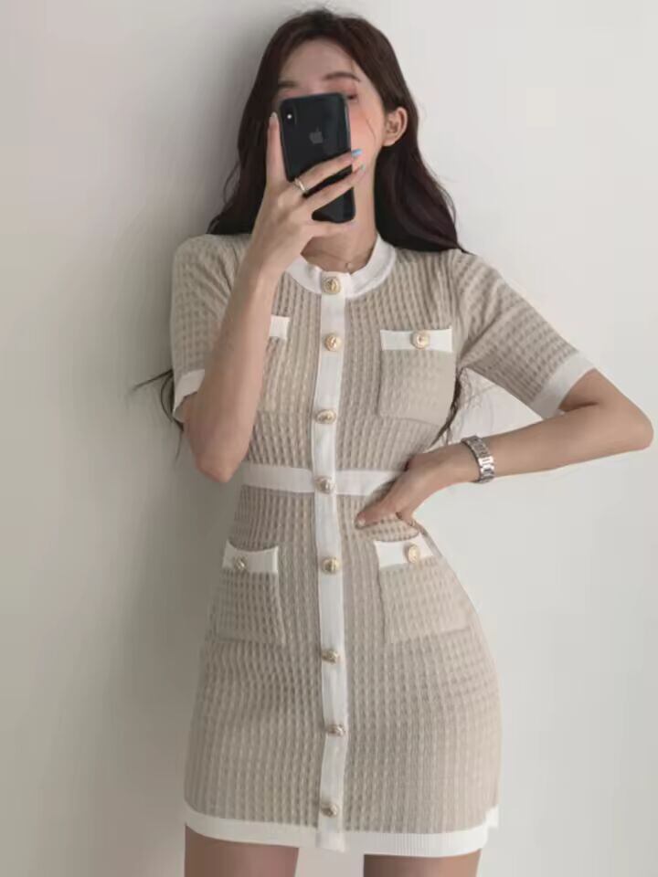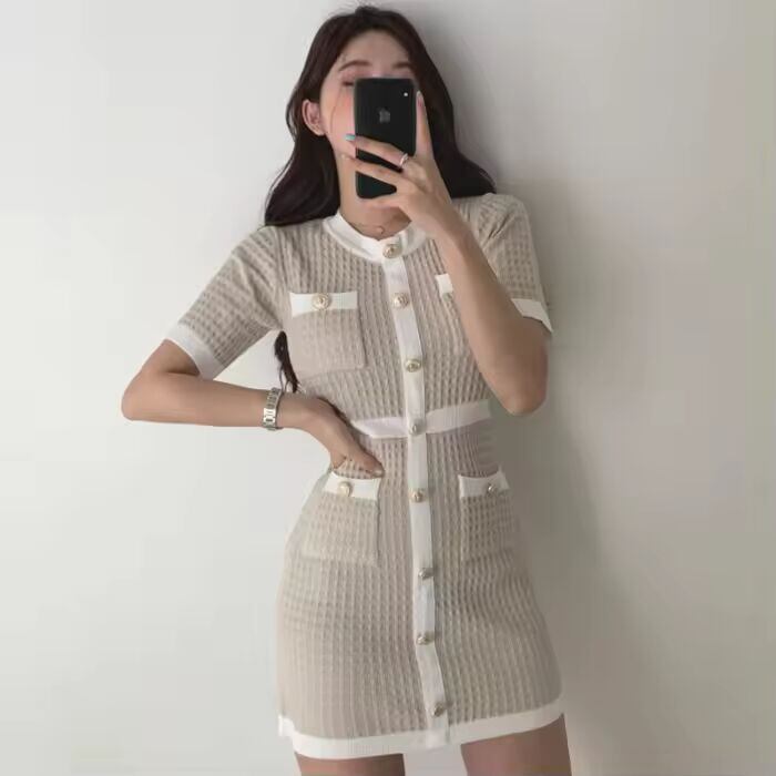 【送料無料◎】 シックな夏の女性用レトロラウンドネックカラーブロックデザインスリムフィットニットワンピースハイウエスト半袖シングルボタンハイウエスト