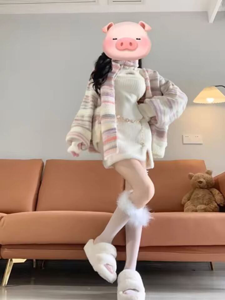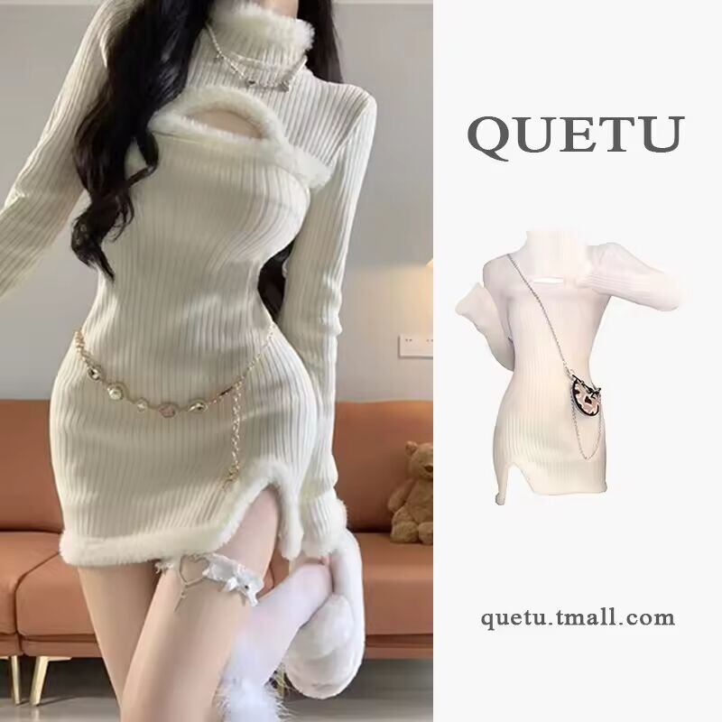 【送料無料◎】 白いハイカラーニットドレス女性のインナーウェア春の新スタイル純粋な欲望セクシーなセーターベースウエストインナーショートスカート