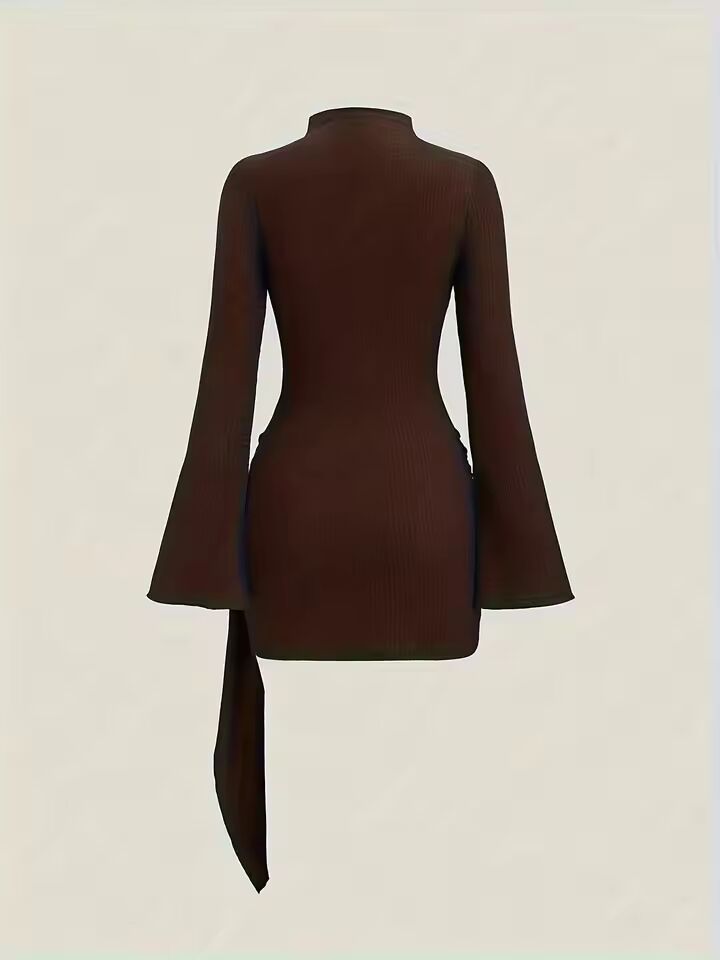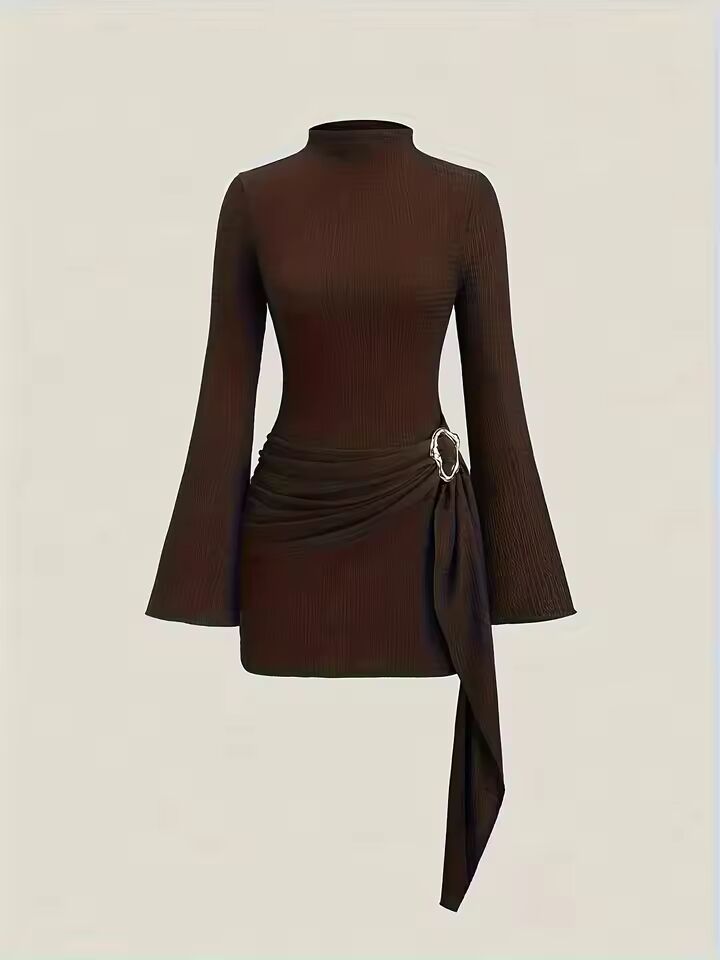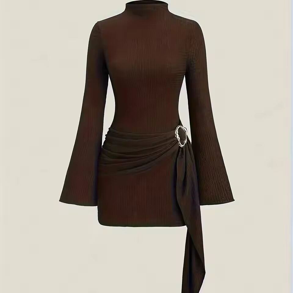 【送料無料◎】 エレガントなデザインのレディース秋冬ニットワンピース、無地ハイネック長袖、メタルバックルウエストシンチ付き