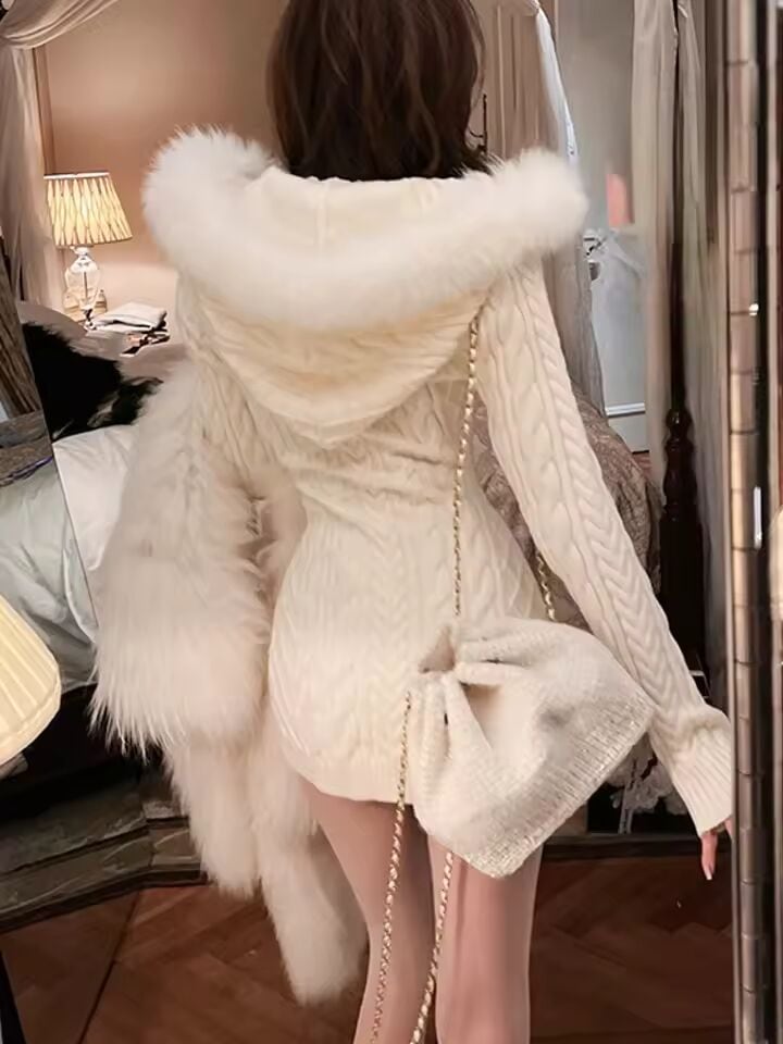 【送料無料◎】 2023 冬ニットセータードレスフード付き女性スリムボディコン Y2k ミニドレスフェイクファー女性ワンピースドレス韓国エレガント