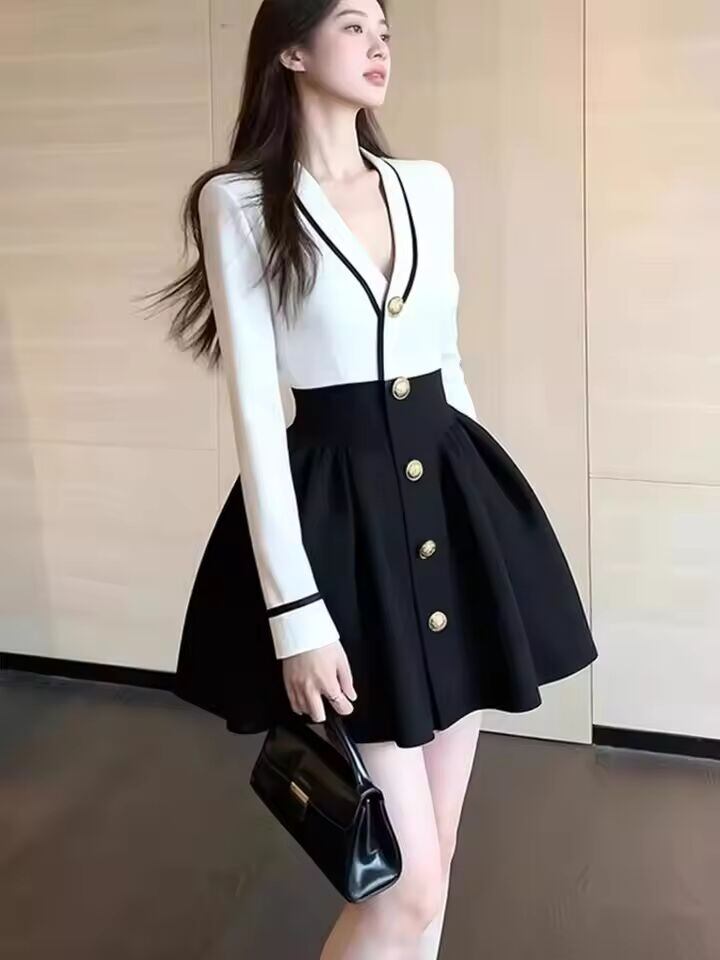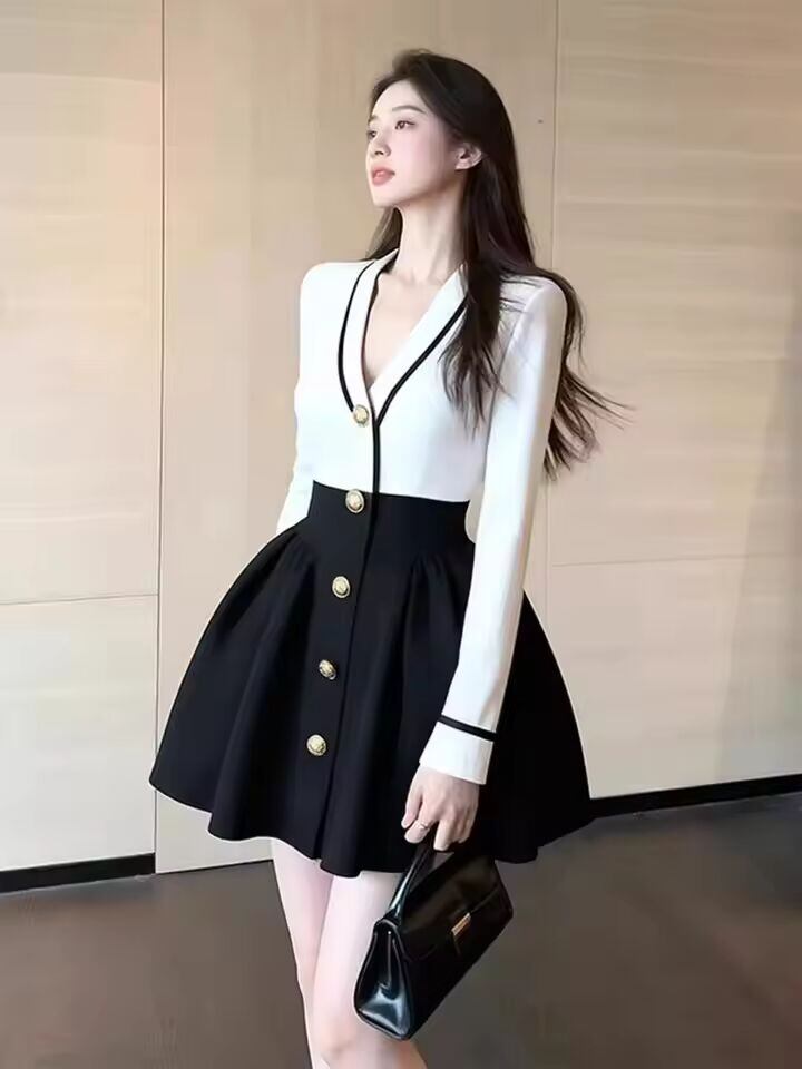【送料無料◎】 スリムVネックニットAラインミニドレス レディースファッション 秋冬スタイル フレンチエレガント ウエストシェイプショートスカート