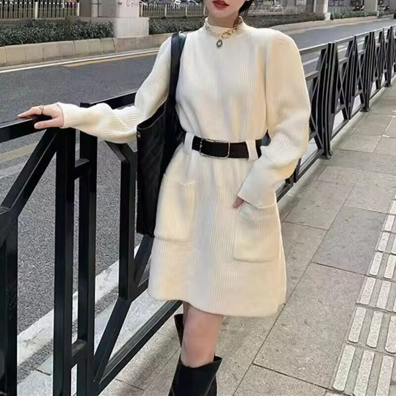 【送料無料◎】 秋冬ストライプニットドレス女性韓国ファッションダブルポケットショートドレスレディースカジュアルルーズ長袖ニットドレス