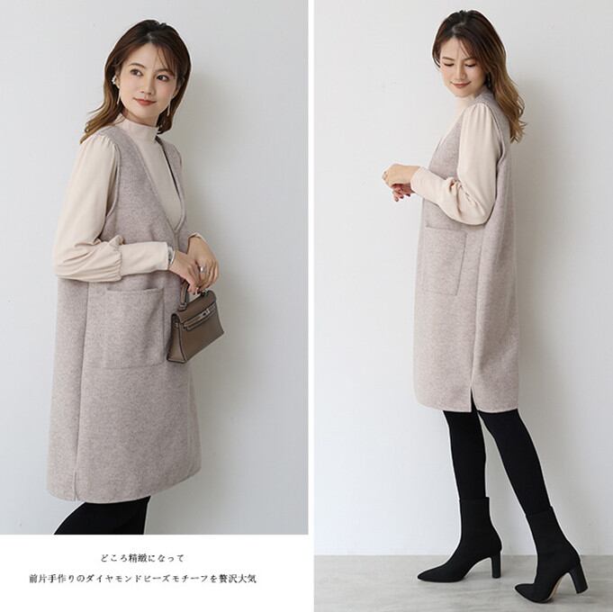 秋冬向きの厚手生地を使用、レディースベストワンピース。