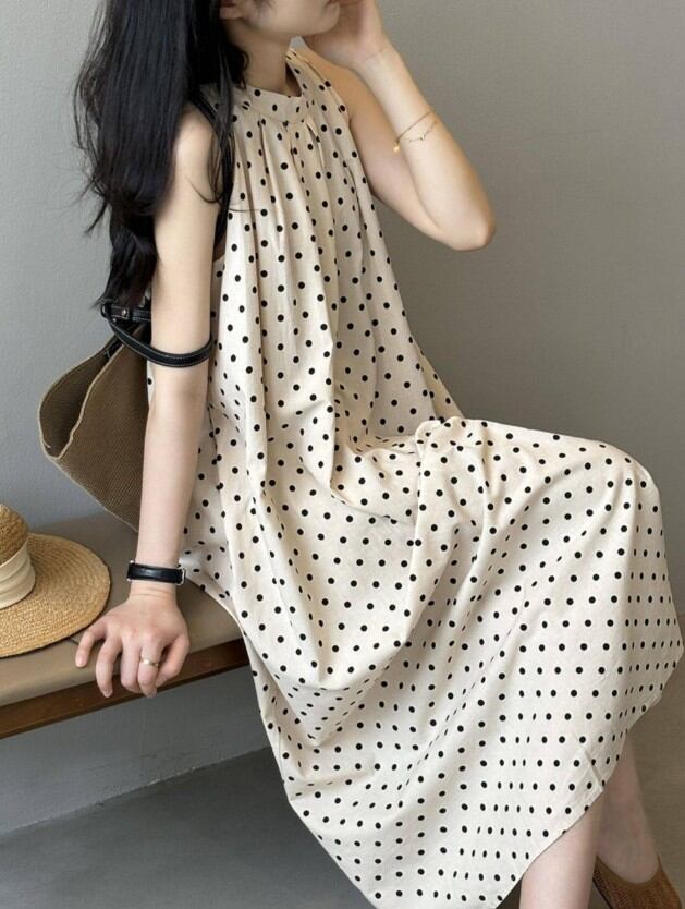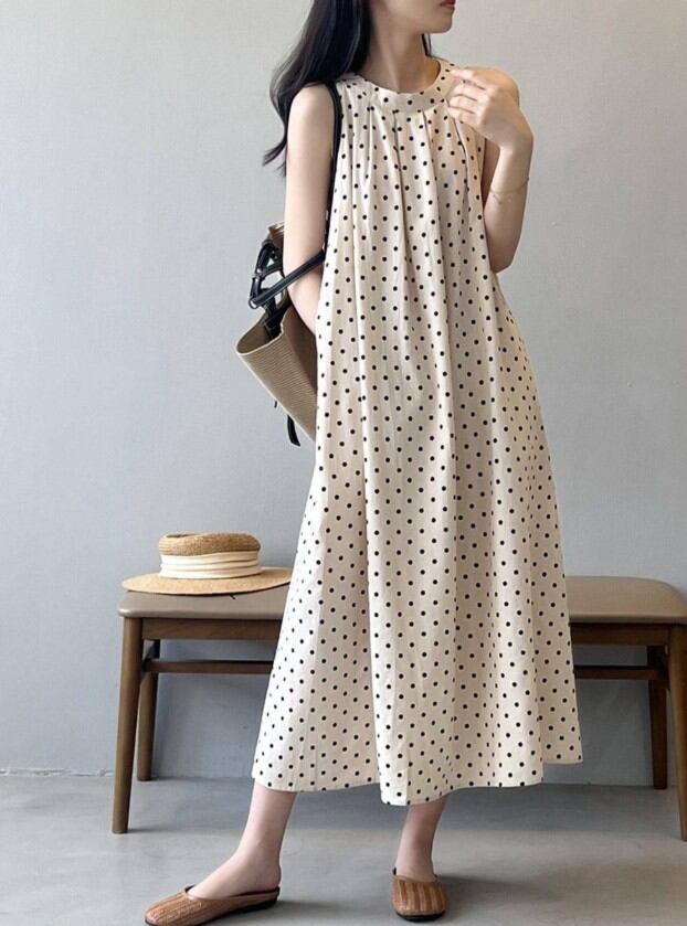 ◎【送料無料】ワンピース レディース ロング丈ワンピ ノースリーブ ビッグシルエット きれいめ ドット柄