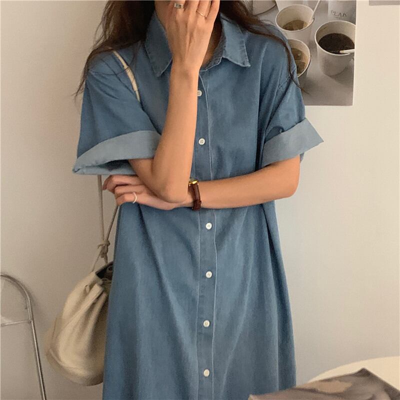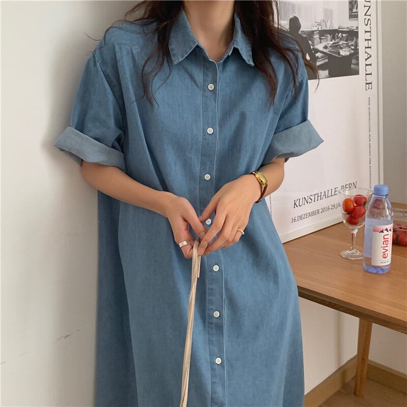 ◎【送料無料】ワンピース デニム シャツワンピース ロング丈 レディース 半袖 着回し スタイリッシュ
