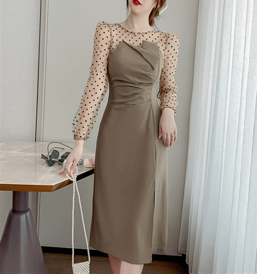 ◎【送料無料】ワンピース 長袖 シフォン パーティードレス ドットラウンドネック 透け感 エレガント