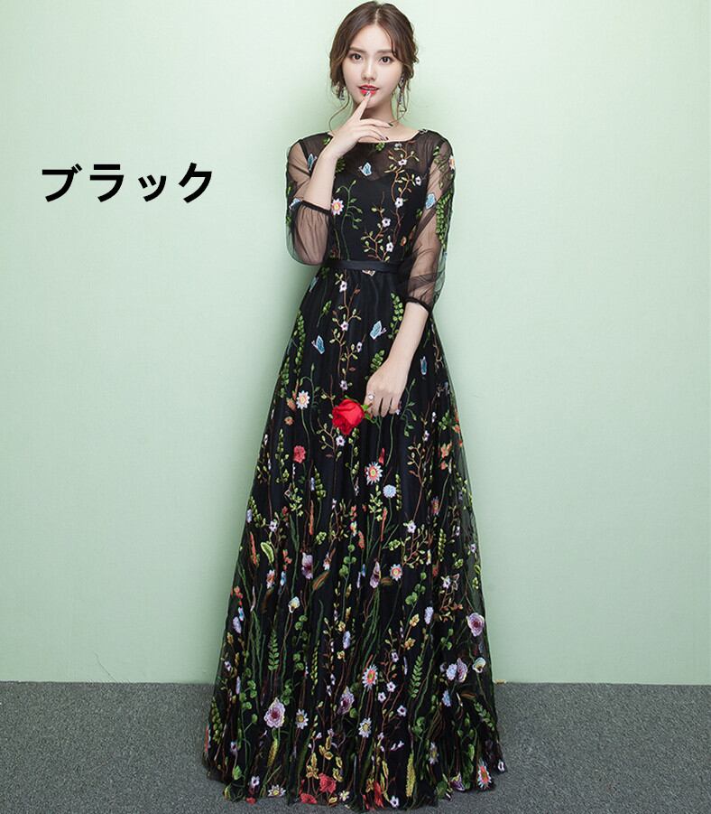 ◎【送料無料】パーティードレス 結婚式 ワンピース 花柄刺繍 Aラインワンピース One Piece ワンピ マキシ丈 ミモレ丈
