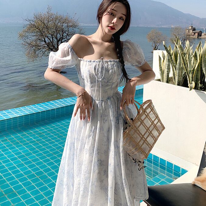 ◎【送料無料】リゾートワンピース 花柄 ロング 体型カバー シースルー 可愛い おしゃれ 半袖ワンピース スクエアネック