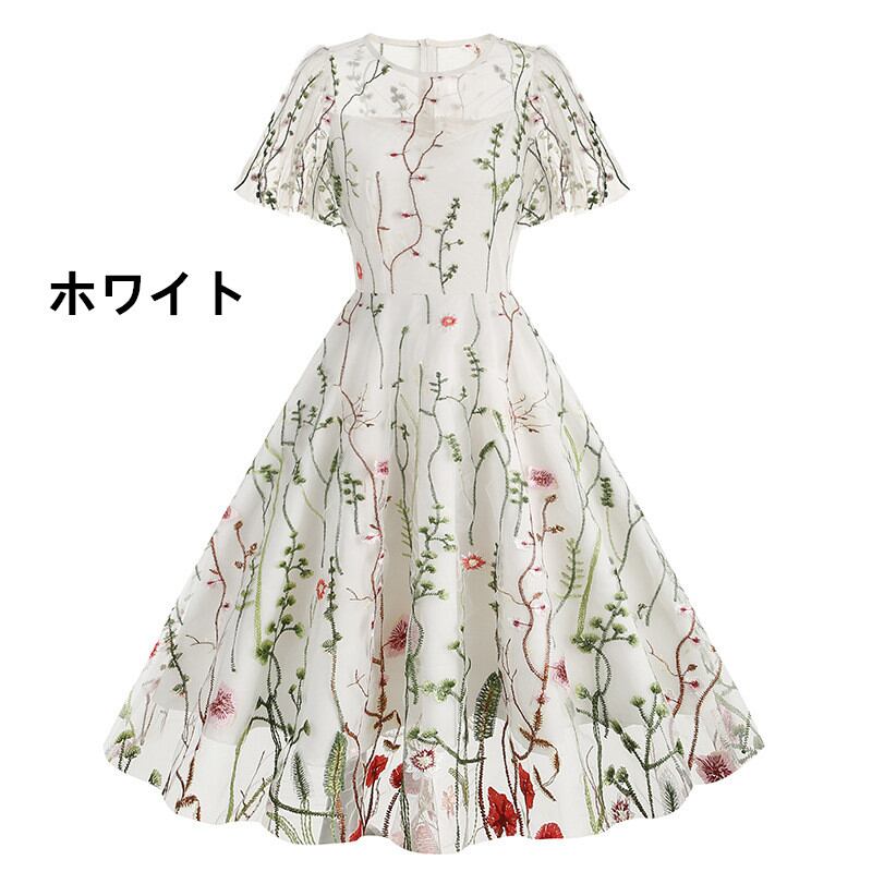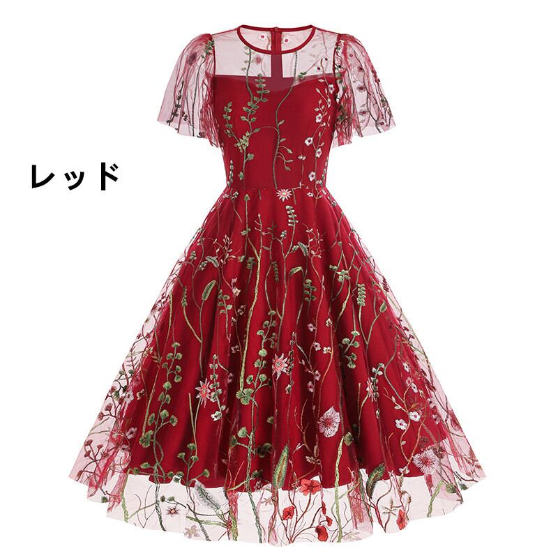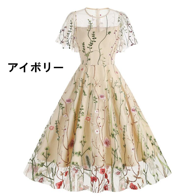 ◎【送料無料】花柄刺繍 ワンピース シースルーワンピース 結婚式 ワンピース パーティードレス 膝丈 ミディアム丈 上品