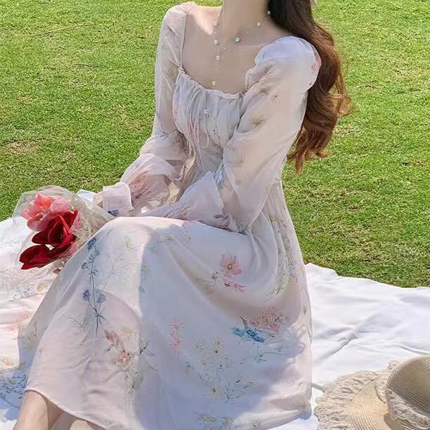 ◎【送料無料】着痩せ シフォン ワンピース レディース ロングワンピース 長袖 キャンディースリーブ 花柄 フレアワンピ