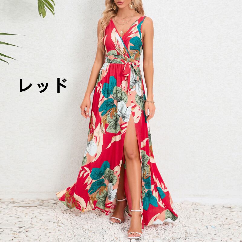 ◎【送料無料】ワンピース マキシワンピース リゾートワンピ ノーカラー ノースリーブ ハワイアン 夏 ロングワンピース