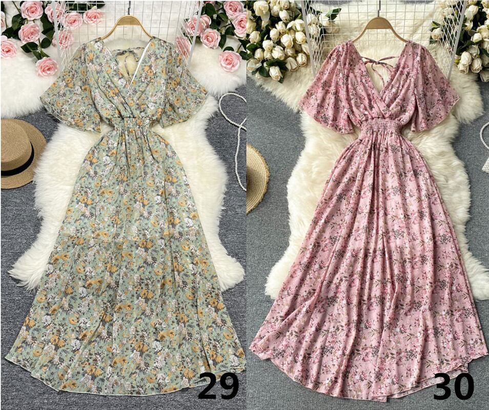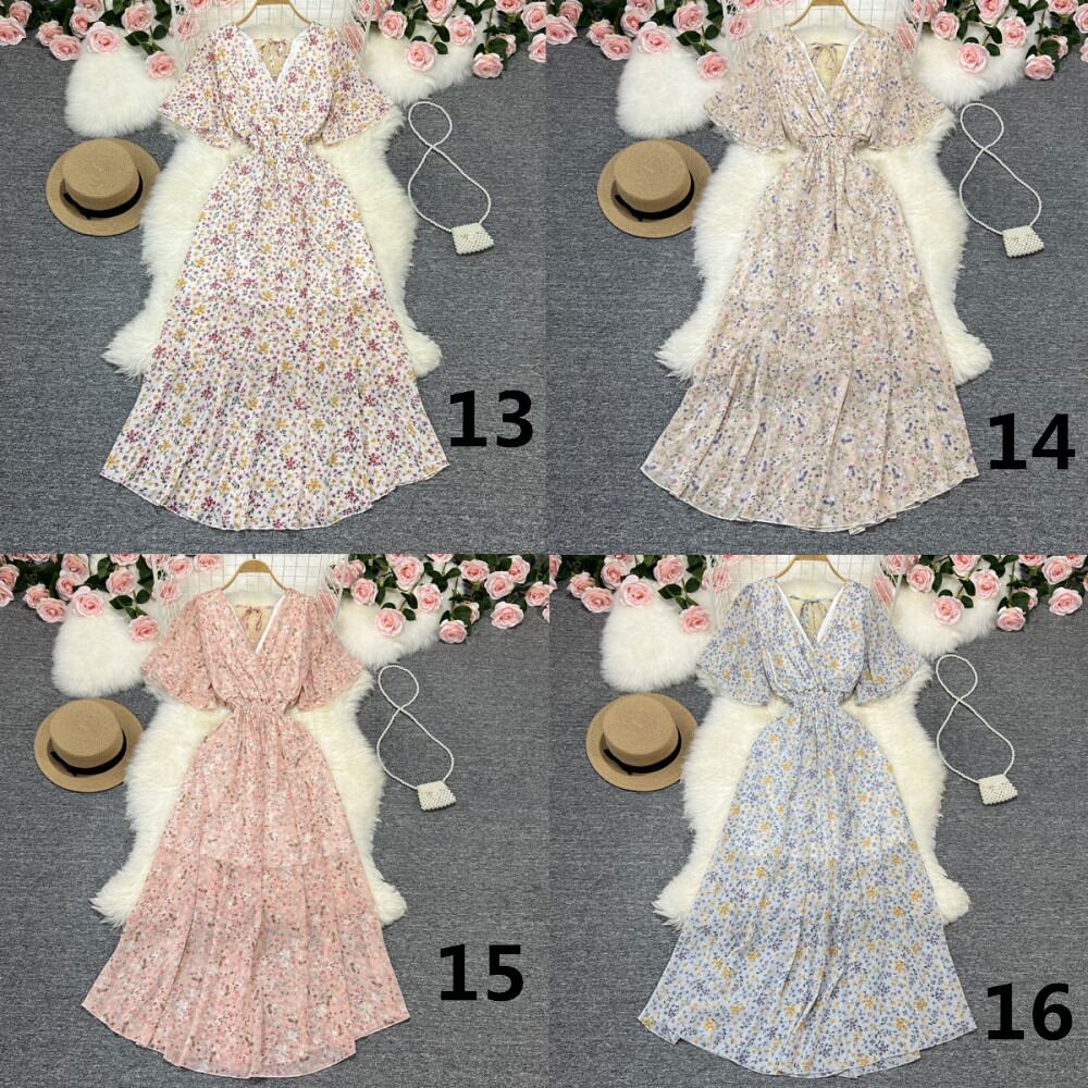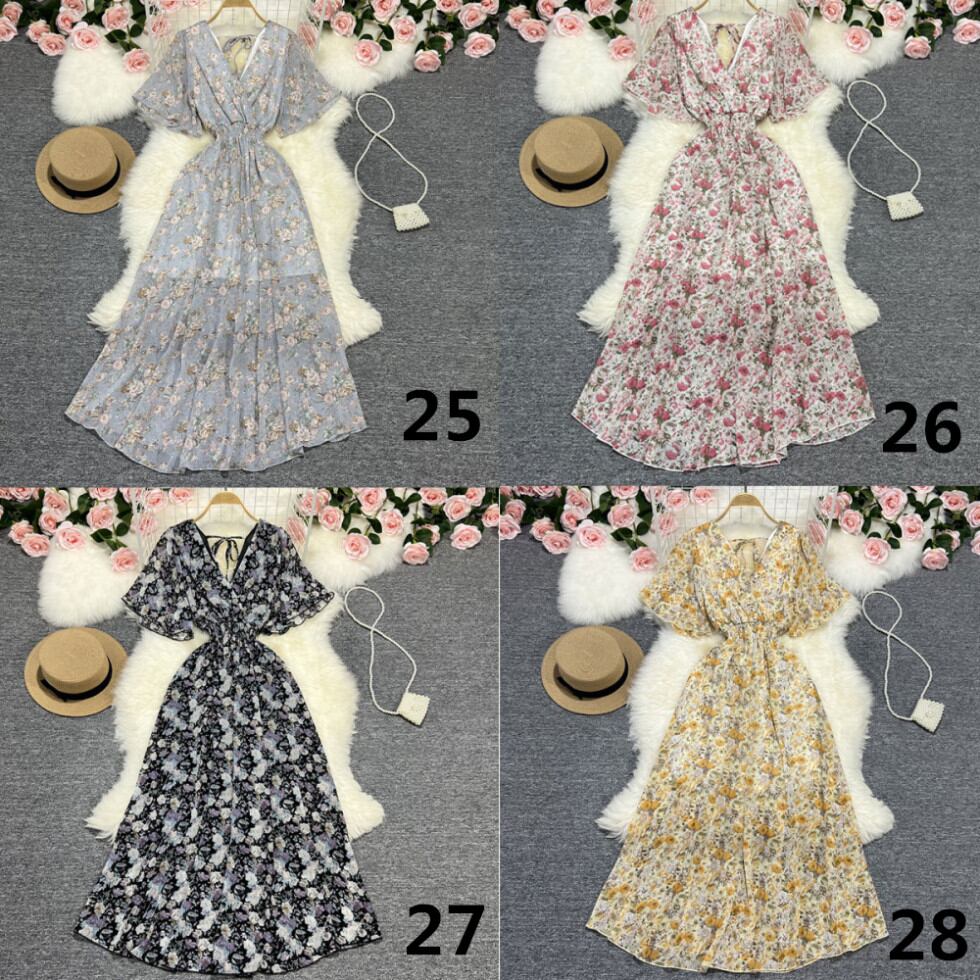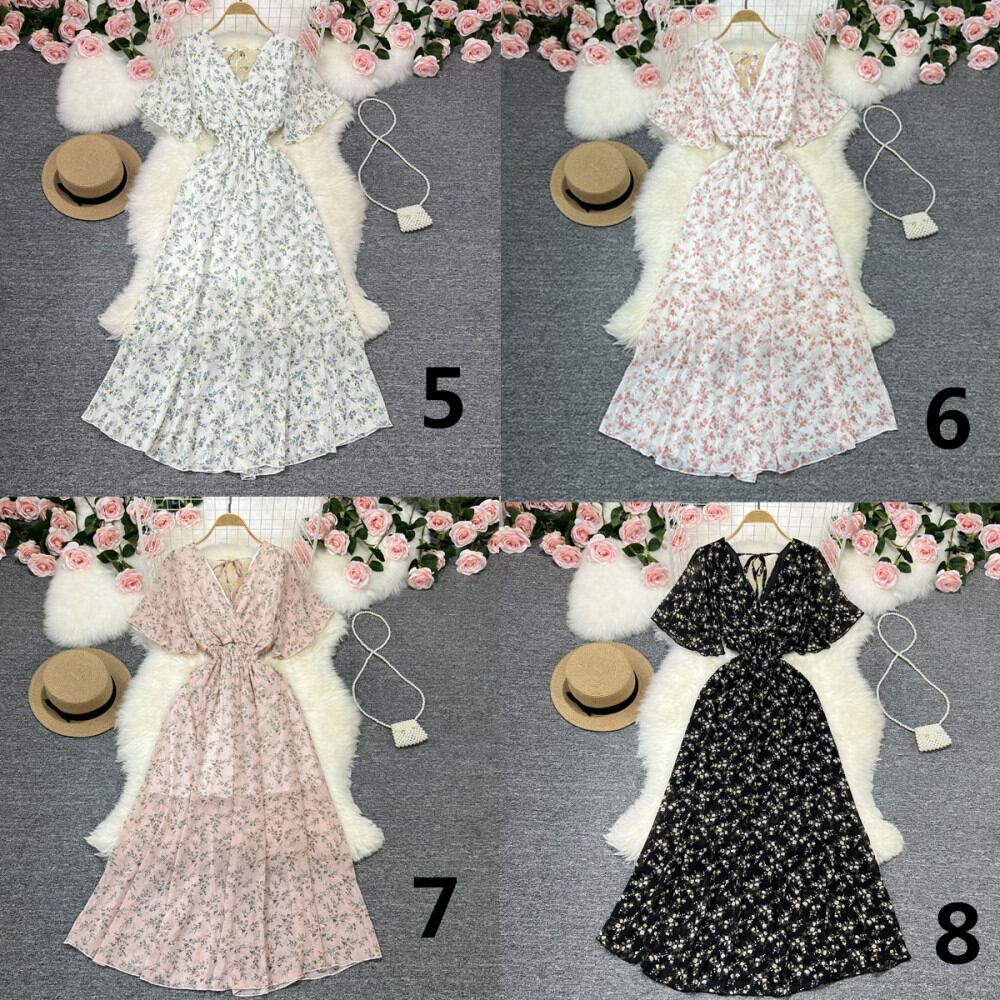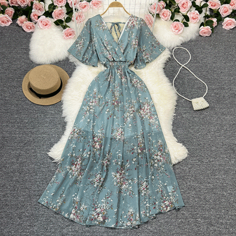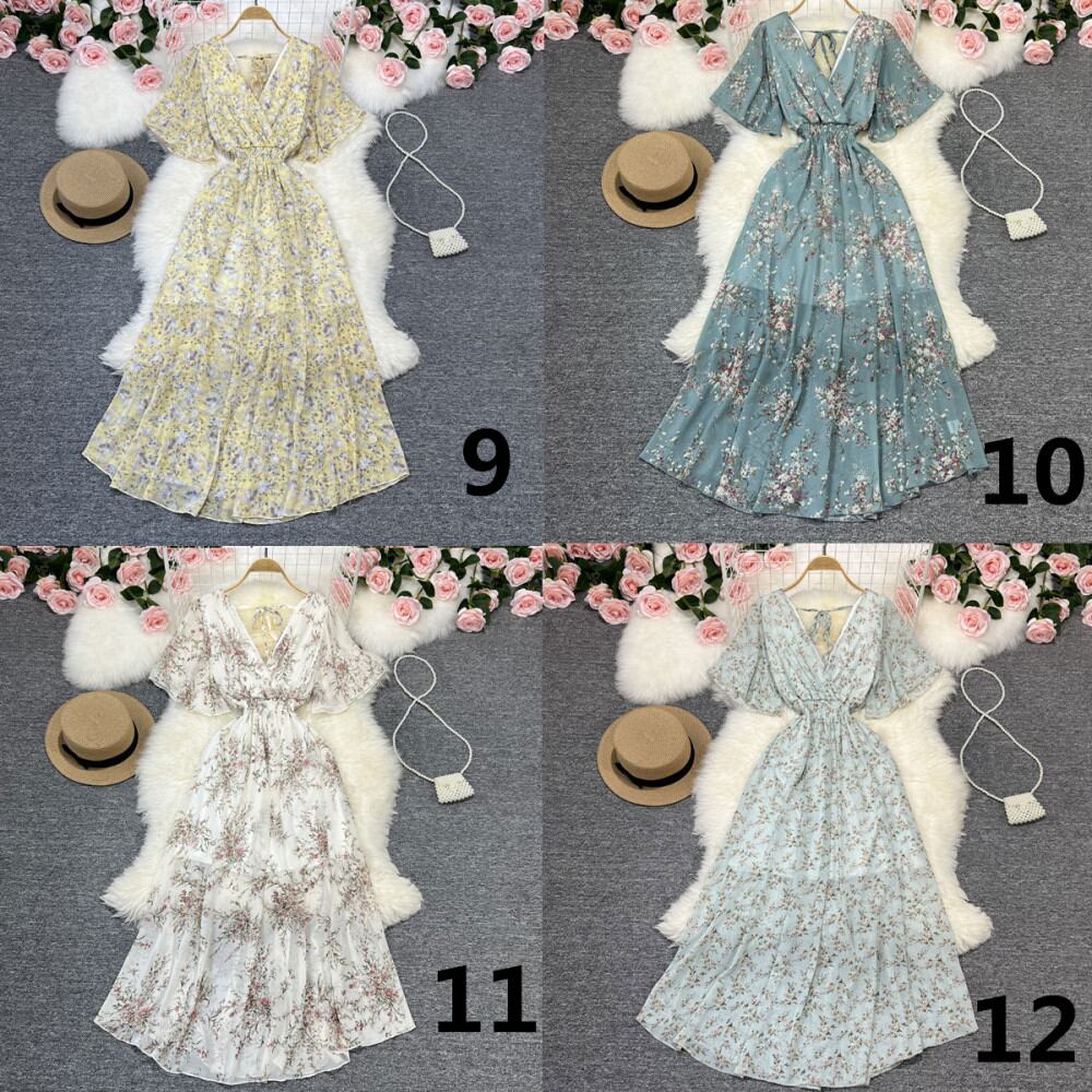 ◎【送料無料】リゾートワンピース レディース サマードレス Vネック ミモレ丈ワンピ バックシャン 半袖 シフォン 透け