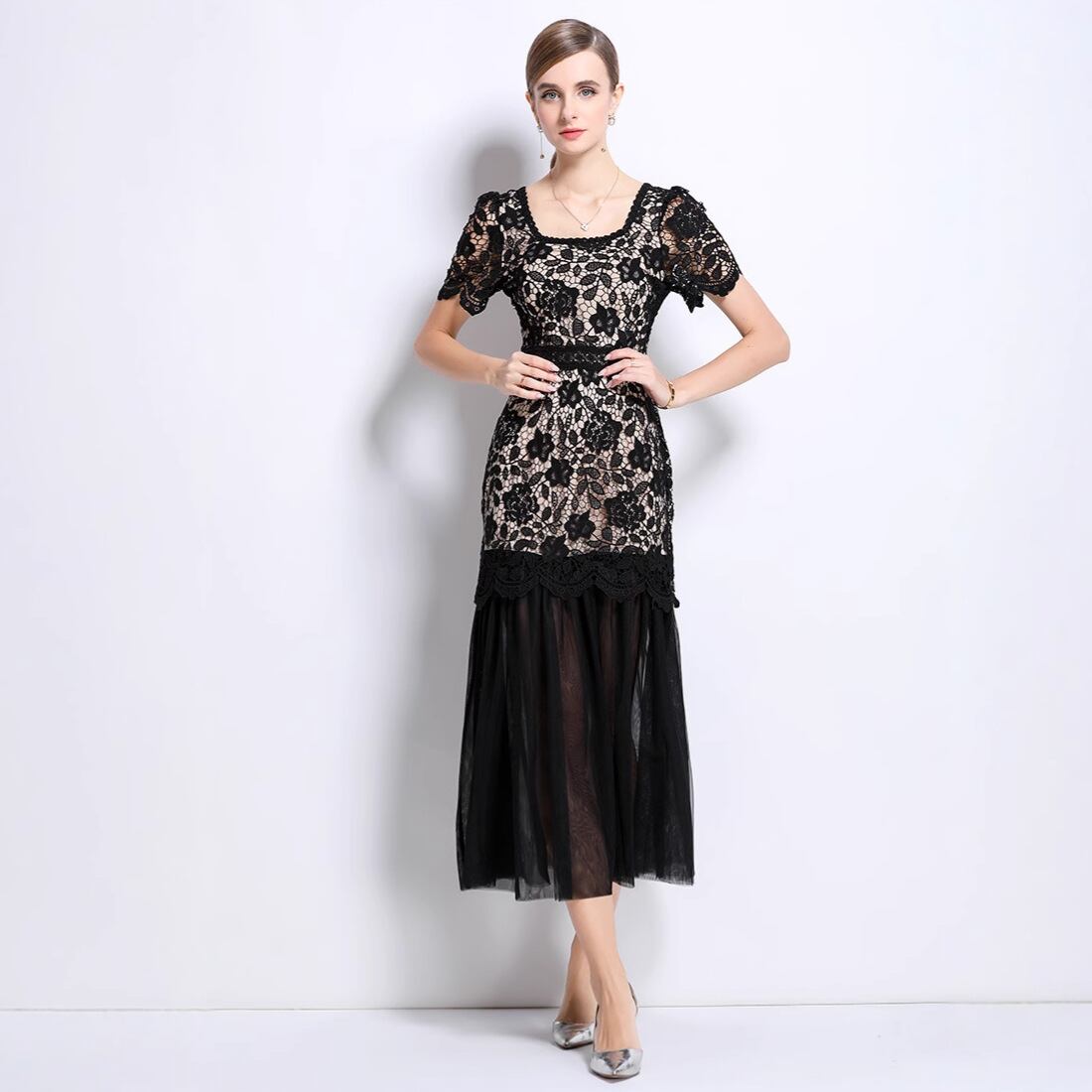 ◎【送料無料】ミモレ丈ワンピース 花柄レースワンピース 切り替え パーティードレス 半袖 夏 秋 高見え エレガント