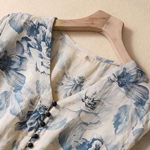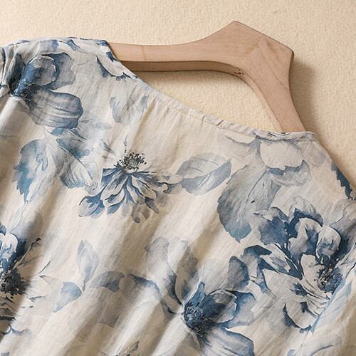 ◎【送料無料】リネン ワンピース 花柄 ワンピ トール丈 Vネックワンピース 半袖 ブルー M L 2L LL XL XXL 春 夏 マキシ