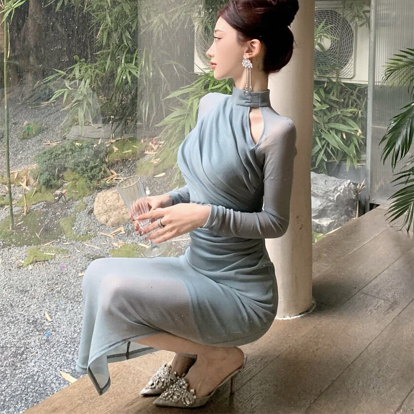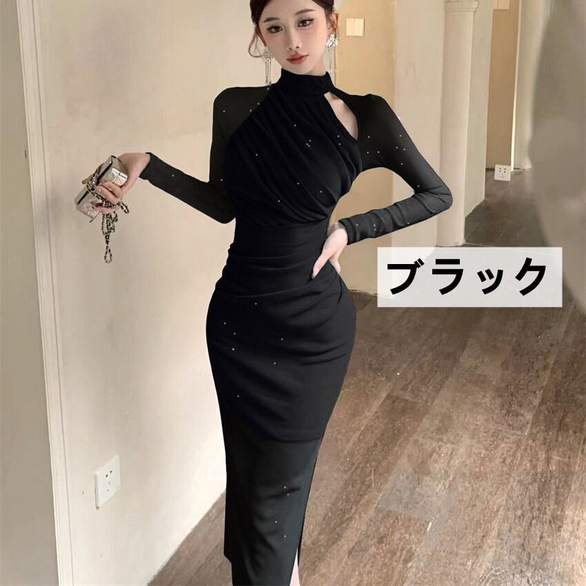 ◎【送料無料】パーティードレス 結婚式 ワンピース ドレス S M L 謝恩会 ギャザー タック 長袖ワンピース キャバドレス