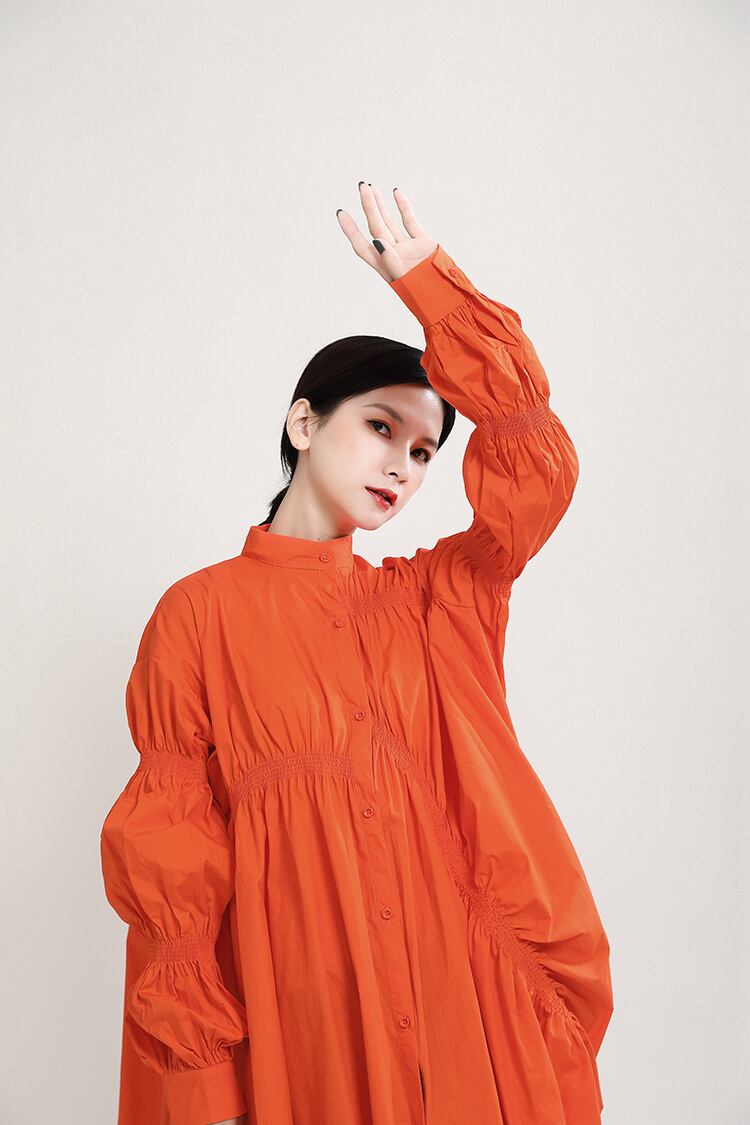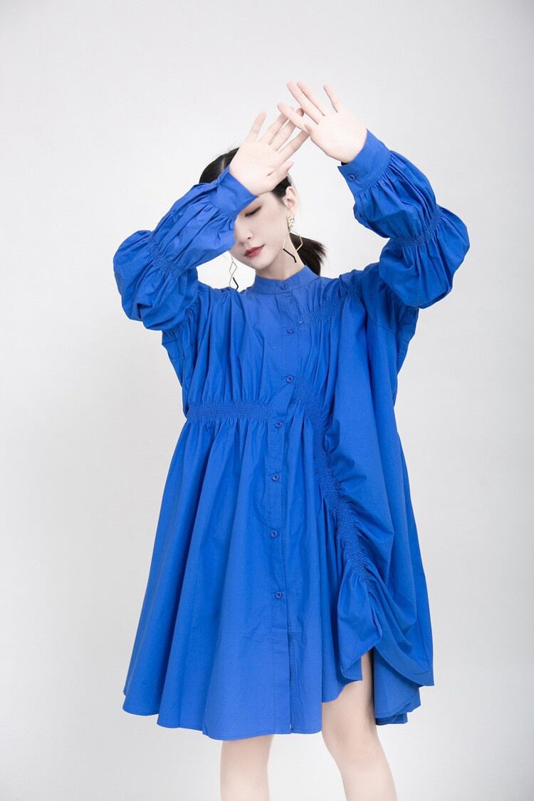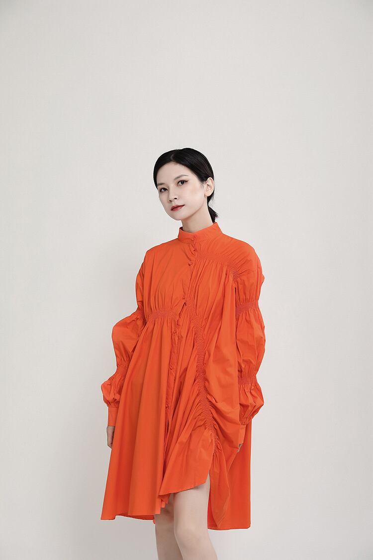 2026春夏コレクション風ワンピース 動きのあるランダムプリーツと大ぶりバルーンスリーブ 後ろ姿も印象的