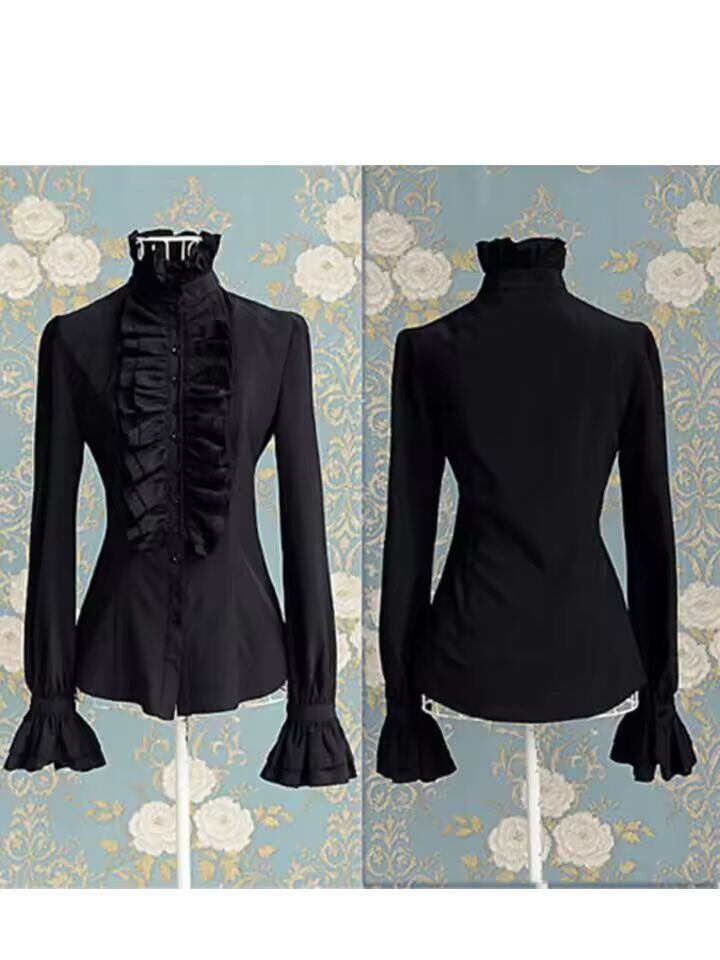 【送料無料◎】 ファッションビクトリア朝のレディーストップスフリル長袖フリル無地 OL オフィスシャツフリル袖口ハイネックブラウス秋トップス