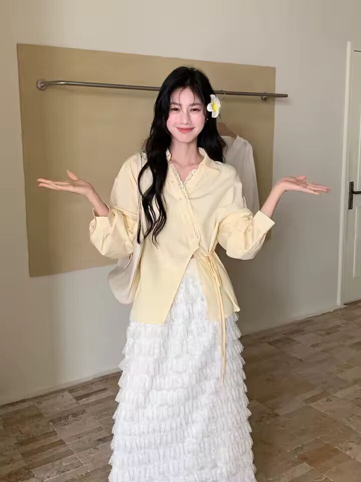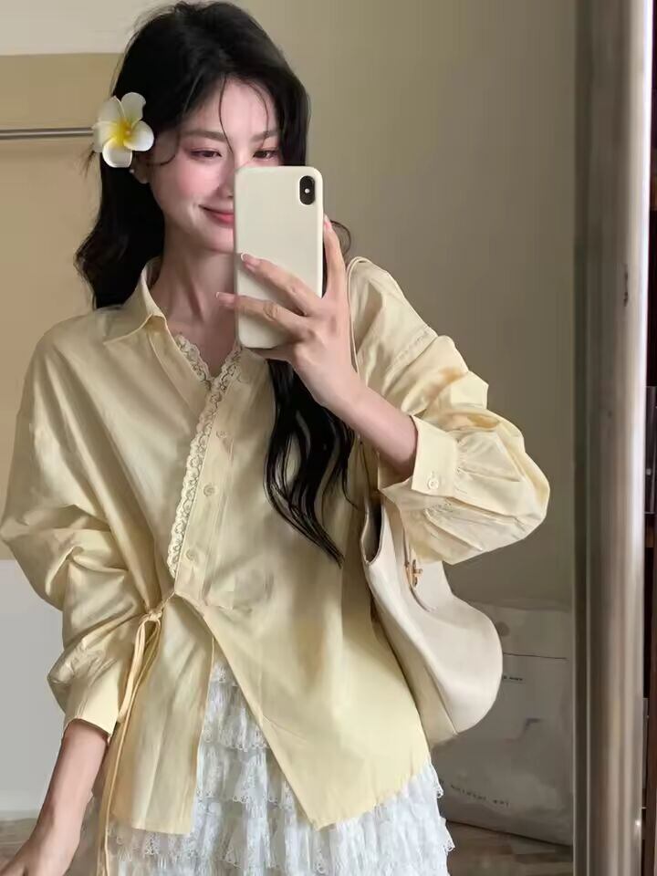 【送料無料◎】 エレガントなレーストリムシャツ女性の韓国デザインユニークなサイドタイ美しい小さなシャツストレートカット長袖 V ネックピュアカラー