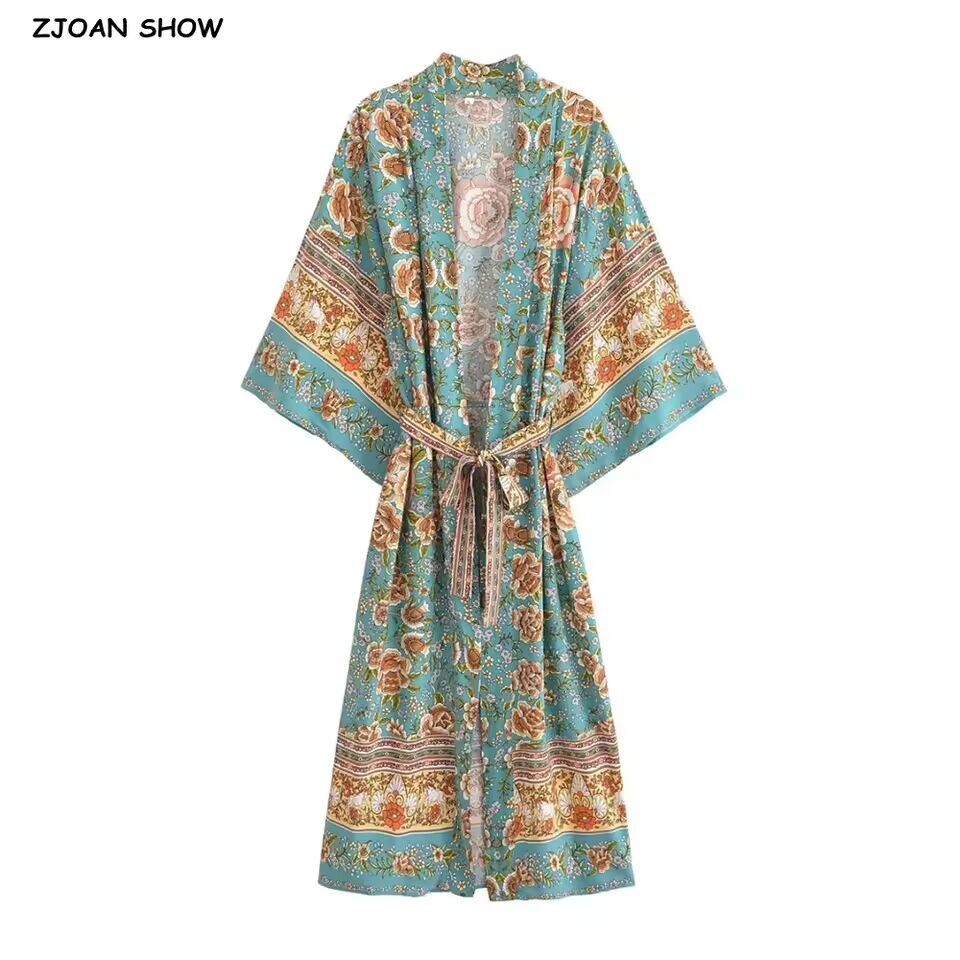 【送料無料◎】 緑の花柄の女性用着物シャツ,自由奔放に生きるスリット,バットウィングスリーブ,長いカーディガン,ビーチトップ,リボンベルト,休暇