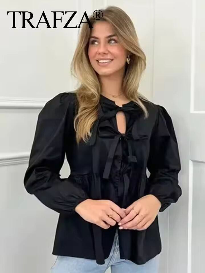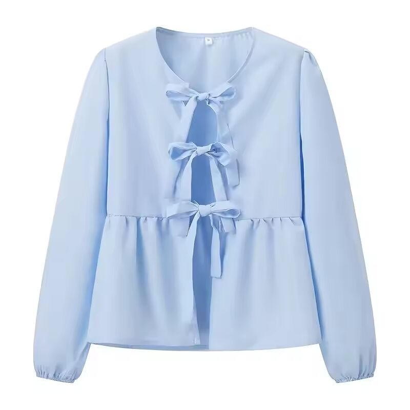 【送料無料◎】 女性用HHシャツ エレガントなフロントボウタイ ピンクブラウストップ パフスリーブシャツ 春夏 レディースカジュアルストリートウェアトップ