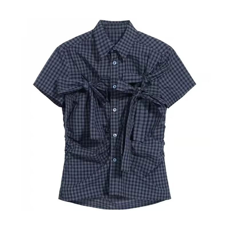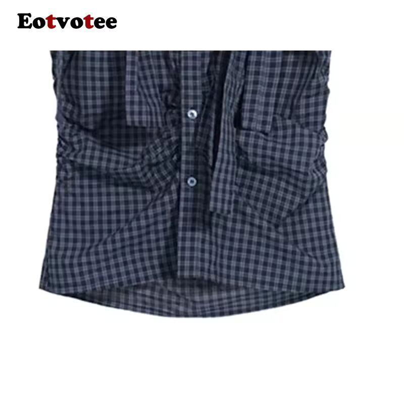 【送料無料◎】 EOTVOTEE チェック柄シャツ女性のファッションシングルブレスト半袖トップス春夏 2025 新しい女性のシックなカジュアル弓シャツ