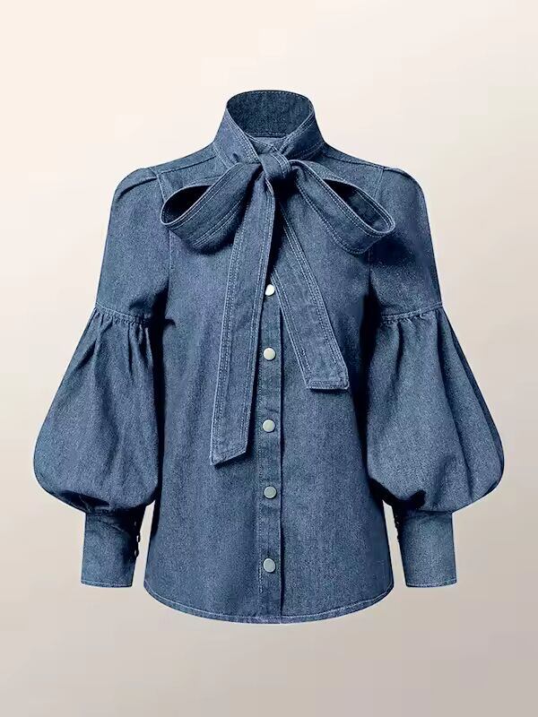 【送料無料◎】 Gymystars 新しいトレンディなイミテーションデニムブラウストップス女性のためのロングパフスリーブリボン装飾ハイネック女性の秋のシャツ