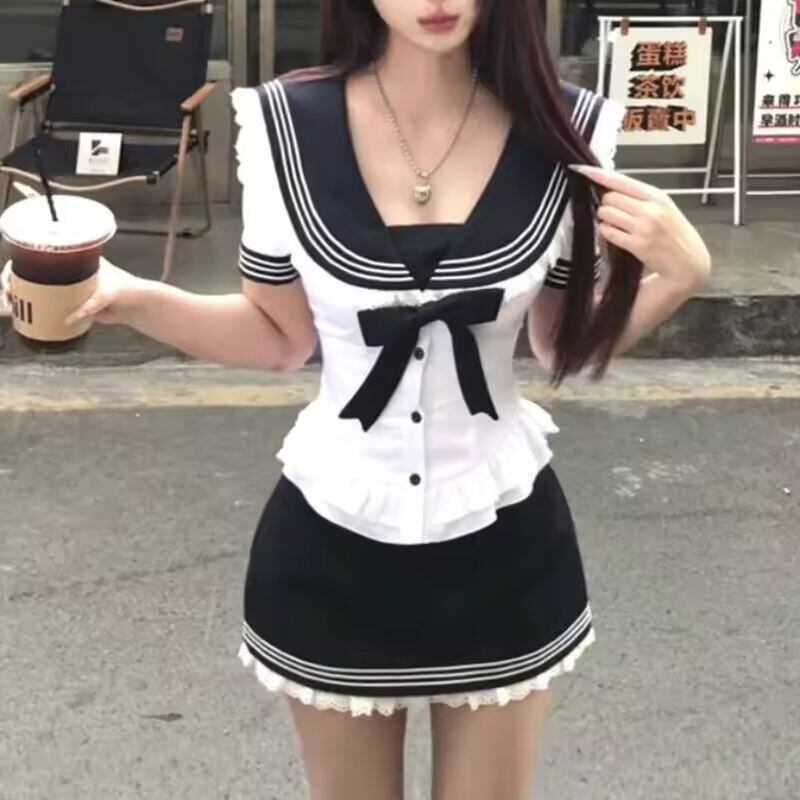 【送料無料◎】 Deeptown 甘い弓セーラー襟女性シャツ白レース半袖日本のファッションブラウススリムプレッピー JK 若々しい夏