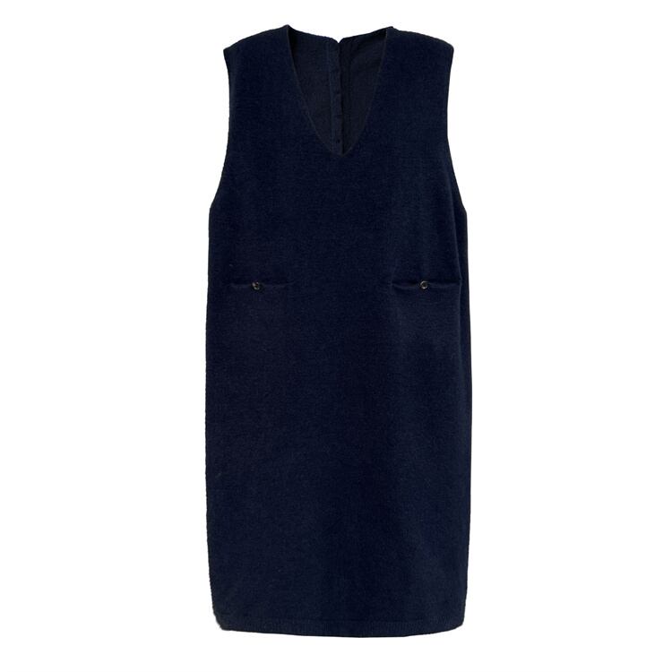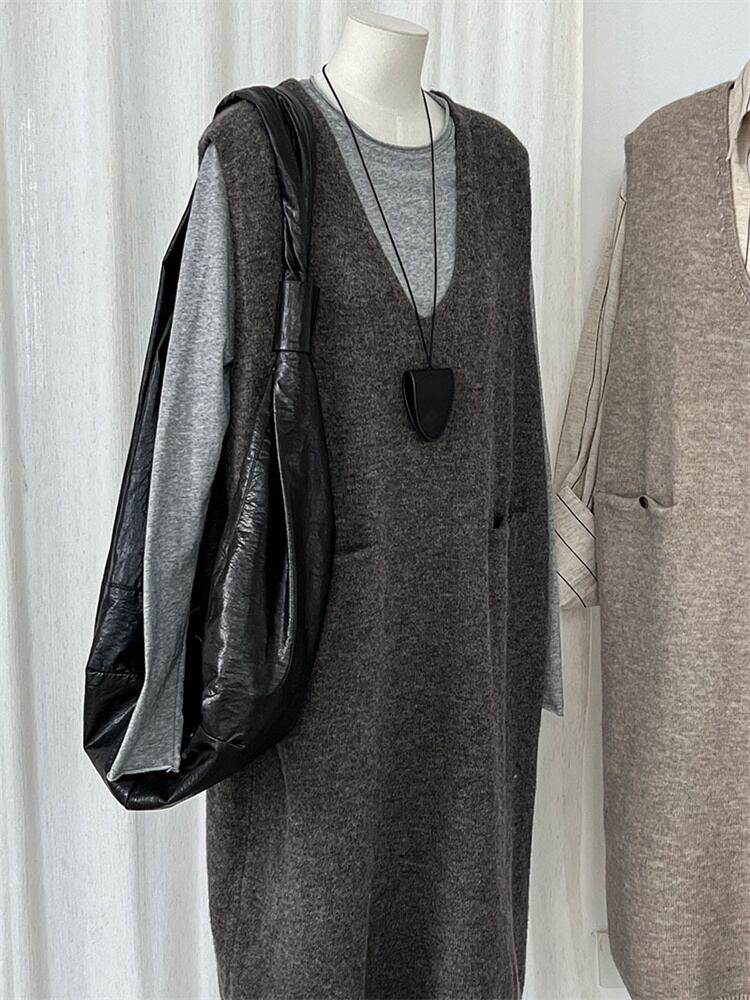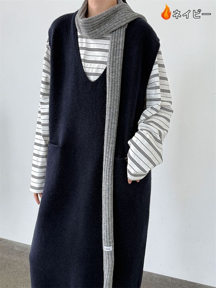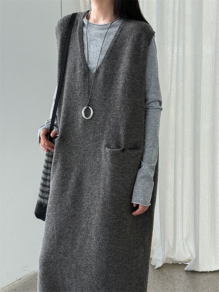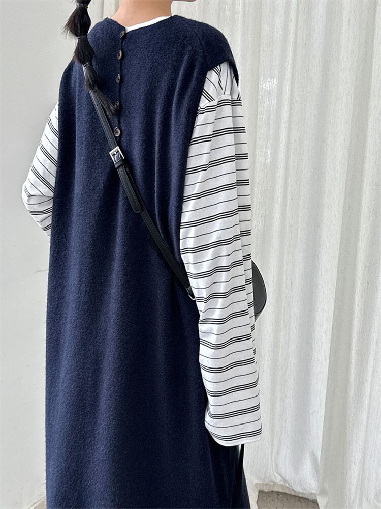 2025秋ゆったりスタイルニットベストドレス 背中ボタンアクセント ラウンドネックノースリーブミディ丈