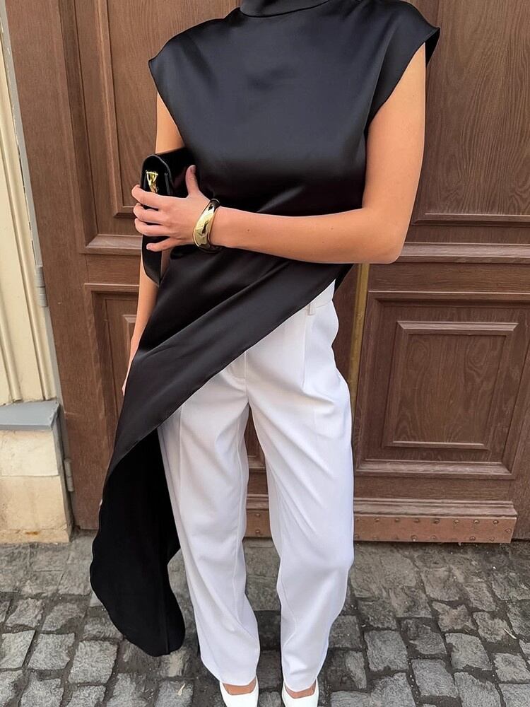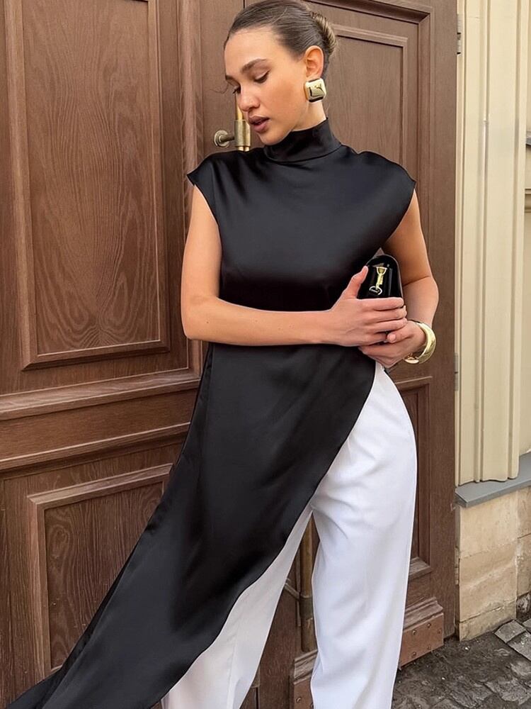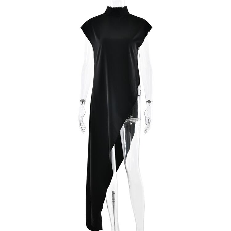 ◎【送料無料】アシンメトリックハイネック 袖なしワンピース 秋のロングファッション