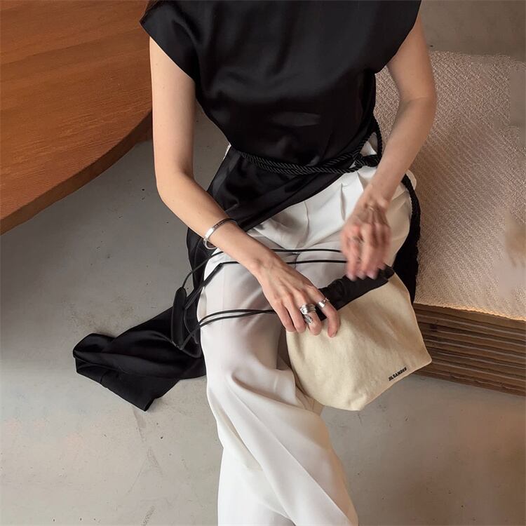 アシンメトリックハイネック 袖なしワンピース 秋のロングファッション