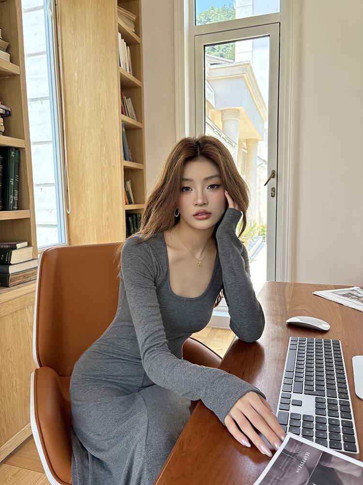 ◎【送料無料】2025秋冬新作 Uネック フィットカット ロングスリーブ ハイウエスト ドレス